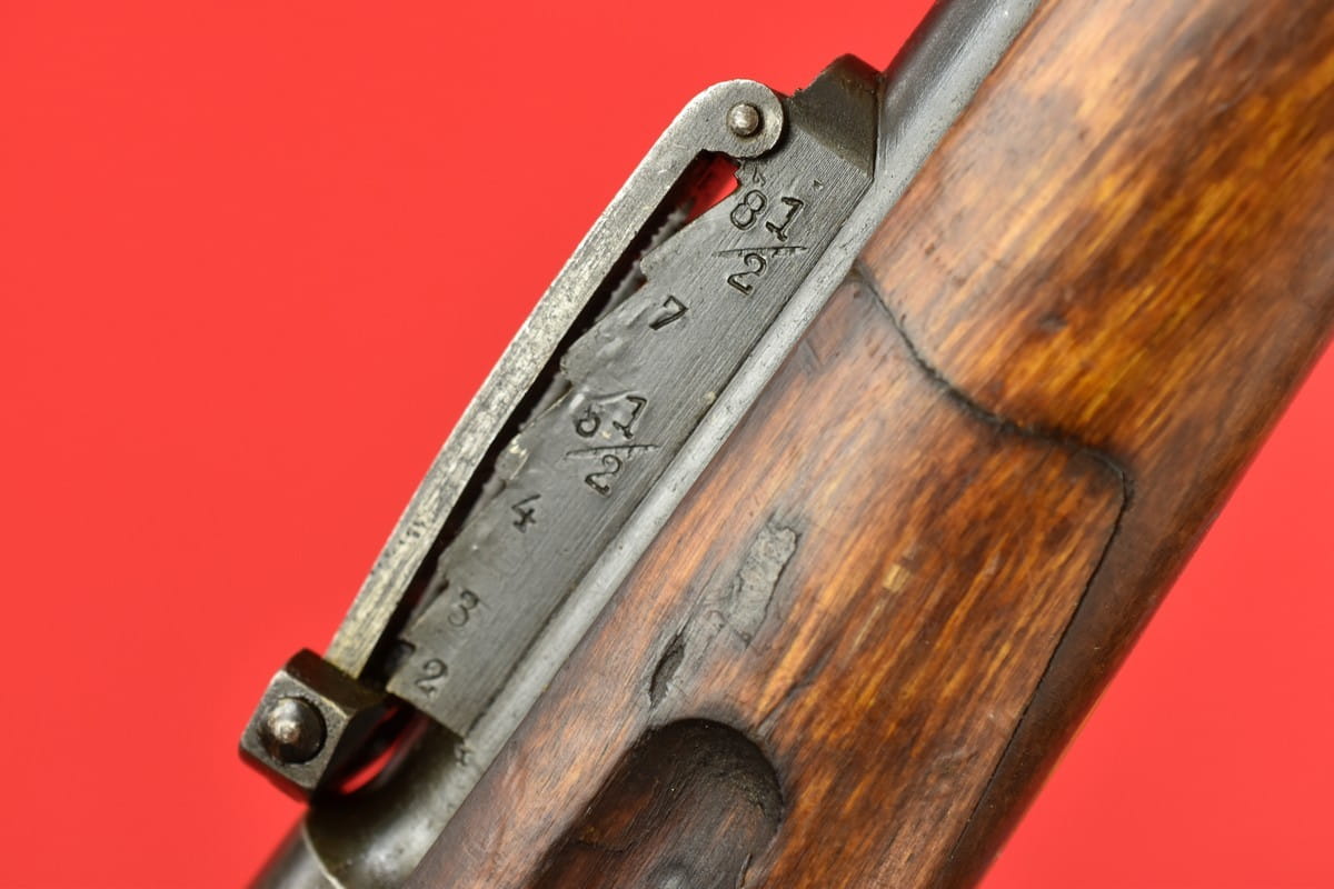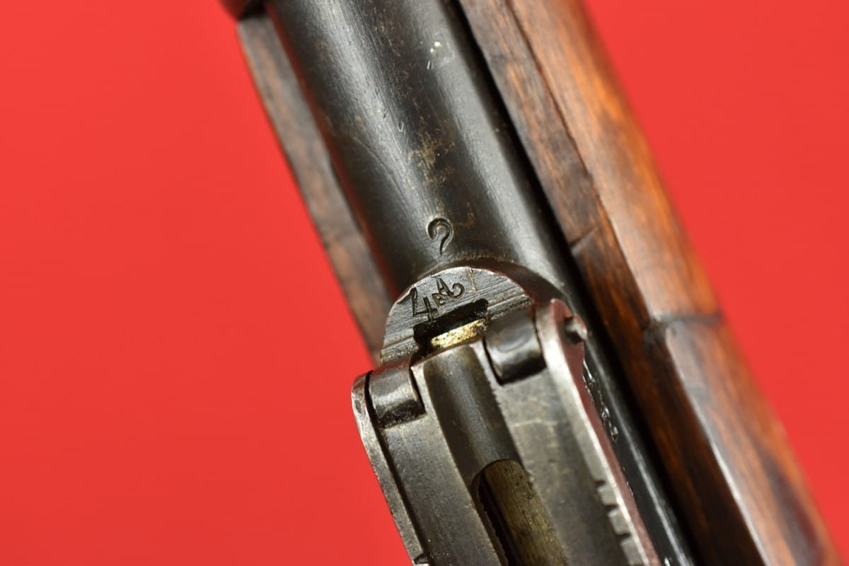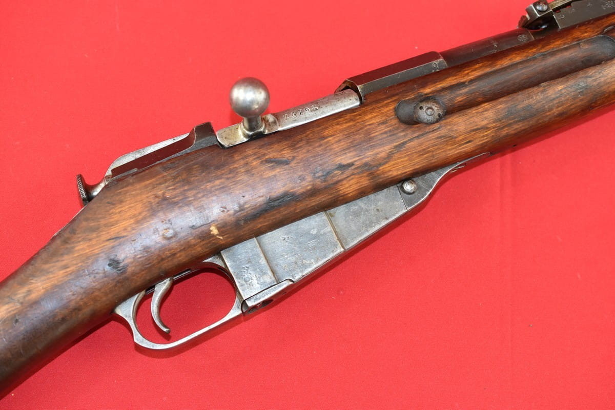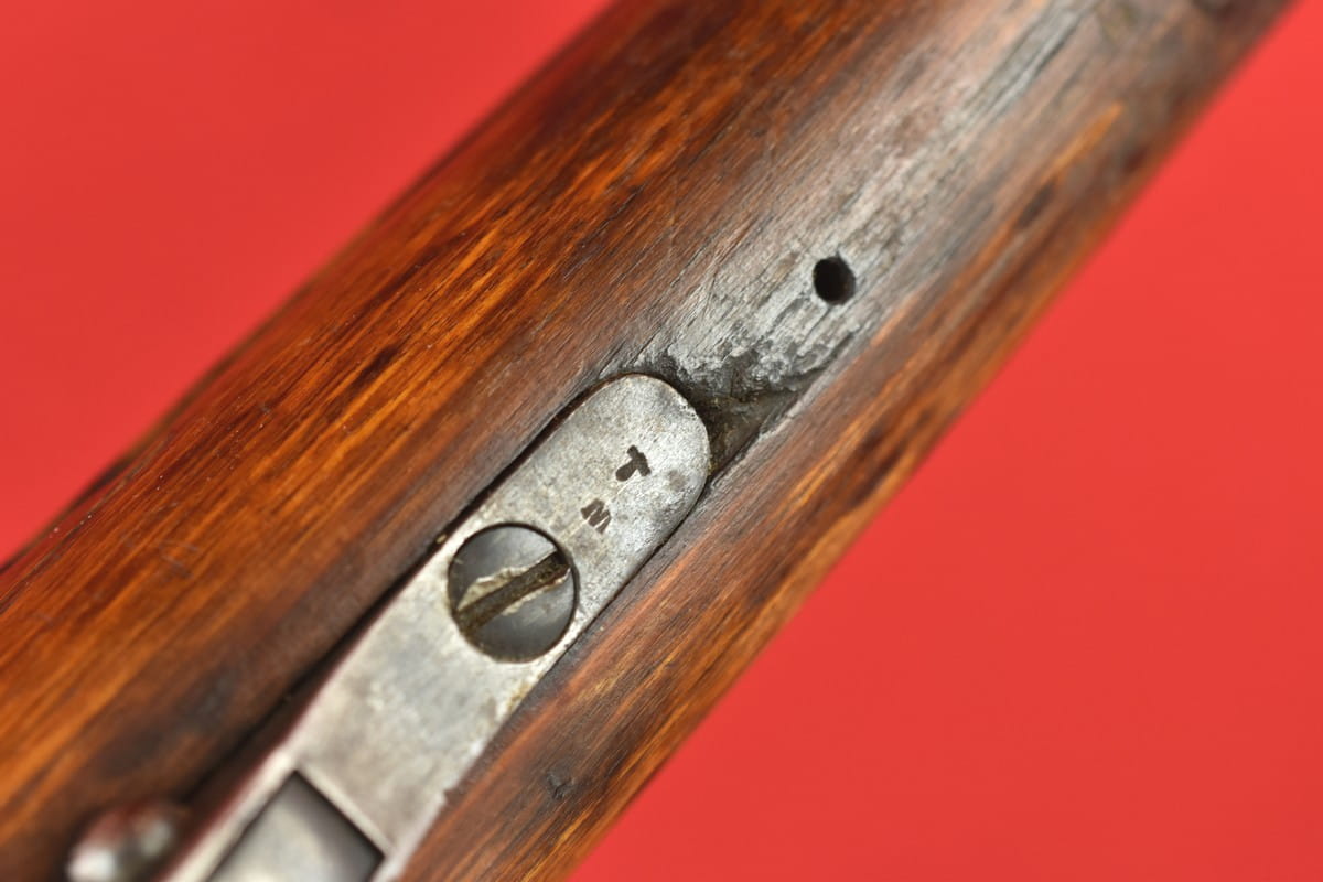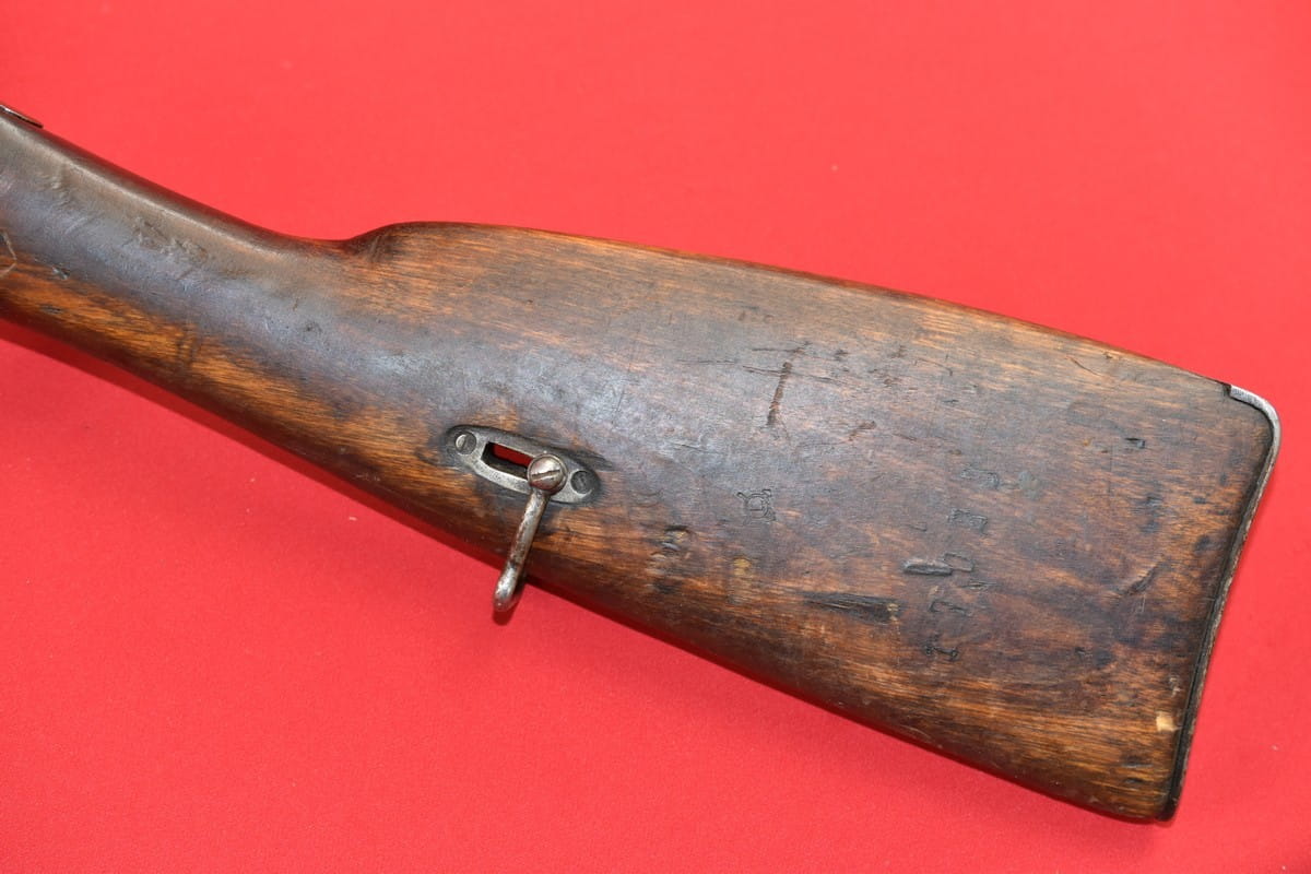 #2713 Karabin: Mosin 1891 produkcji Iżewska z roku 1901 - kal. 7,62x54R. Używany w armii fińskiej - stąd widoczne fińskie ingerencje, oraz fińska kolba. Przewód lufy w stanie słabym. Lufa wystrzelana, gwint jest widoczny - ale równomiernie i całkowicie pokryty siecią wżerów. Zrobiona jest korona lufy - na głębkość 4 cm. Broń bardziej do kolekcji, niż do strzelania. Ogólnie nie kupilibyśmy broni w tym stanie - ale rocznik 1901 jest zacny. No i jest to dalej M1891, nie apgrejdowany do 1891/30.