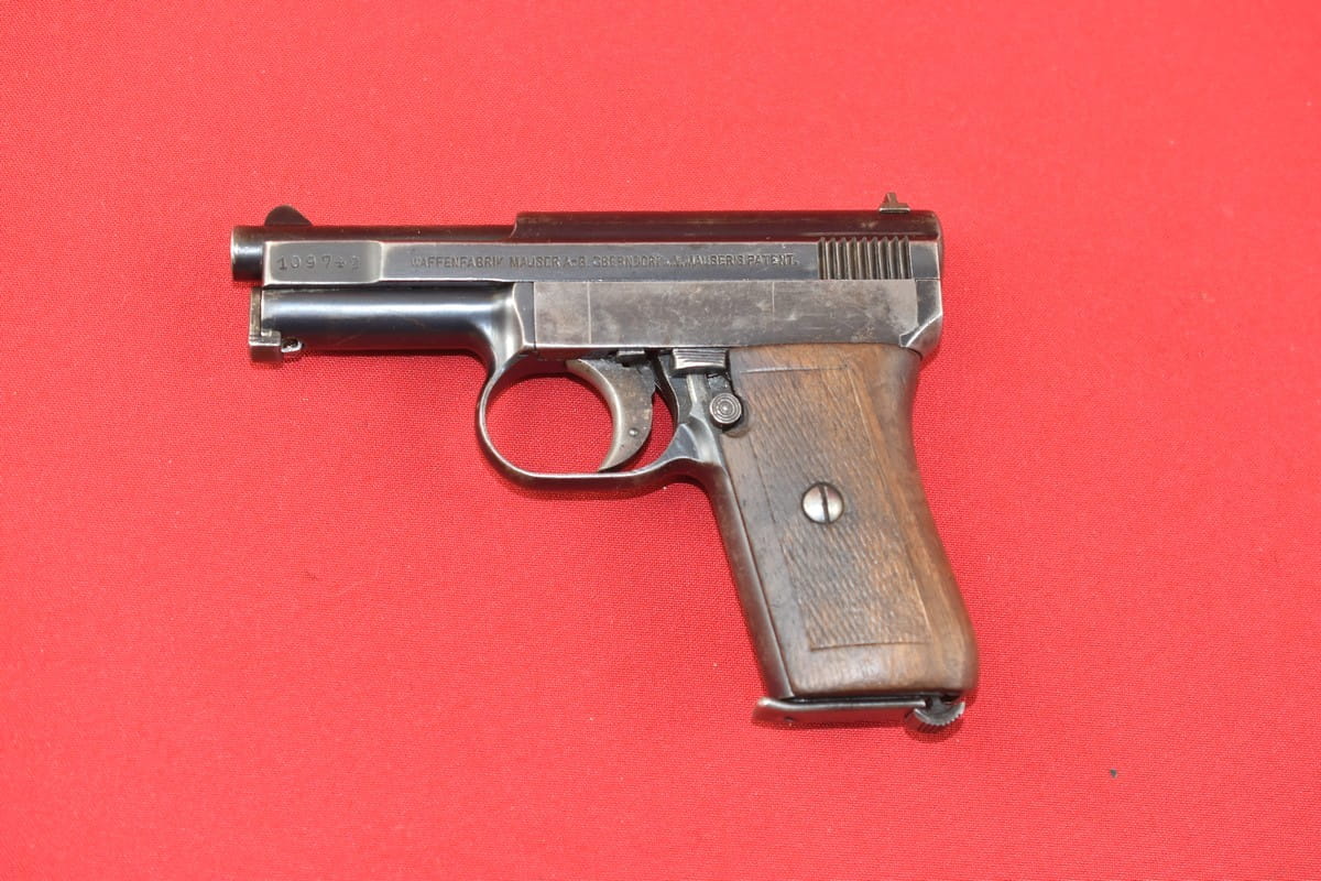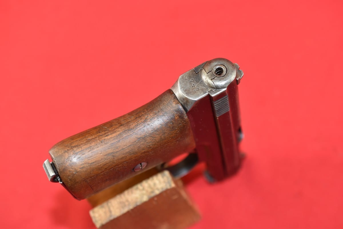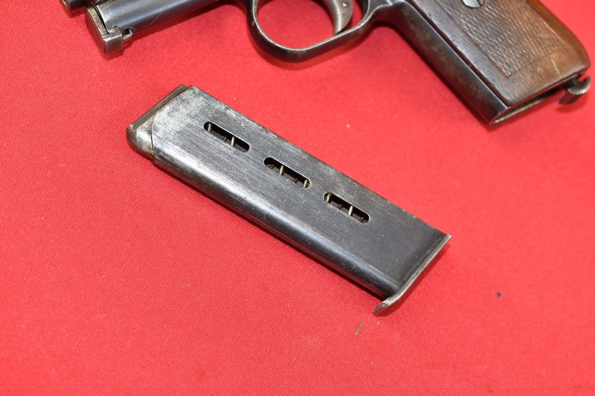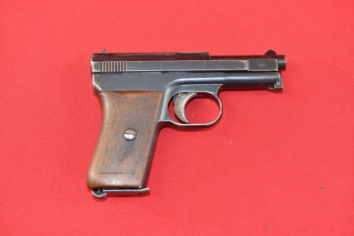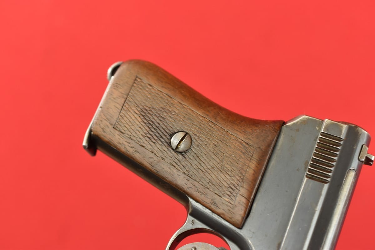 #3267 Mauser 1910/14 Neues Modell kal. 6,35 mm. Bardzo ładny egzemplarz - oryginalna oksyda, nieuszkodzona okładzina. Nic nie było kombinowane, brak powojennych stempli - tylko oznaczenia fabryczne. Brak napraw, brak uszkodzeń. Przewód lufy: gwint ostry, widać ogólne zmatowienie.