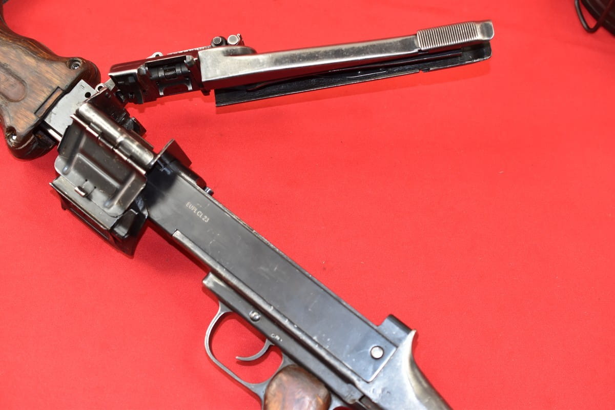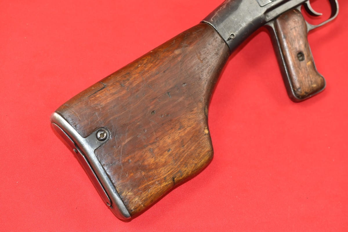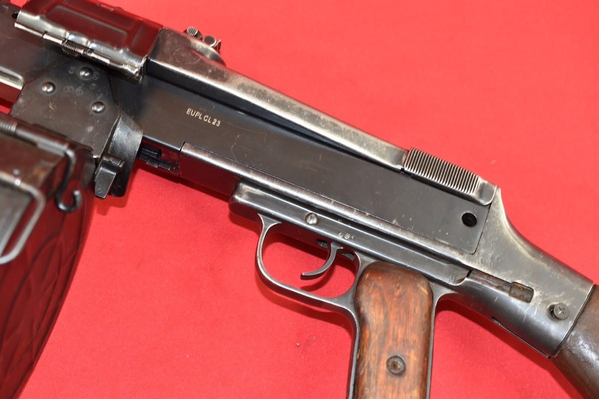 Stan jak widać na zdjęciach - egzemplarz generalnie zużyty i rozklekotany (dlatego stał się PCU). Łoże rusza się, brak pinu mocującego kolbę do komory zamkowej (zastąpiony obecnie wkrętem), itd. Ewentualne poprawki zostawiamy ewentualnemu kupującemu.