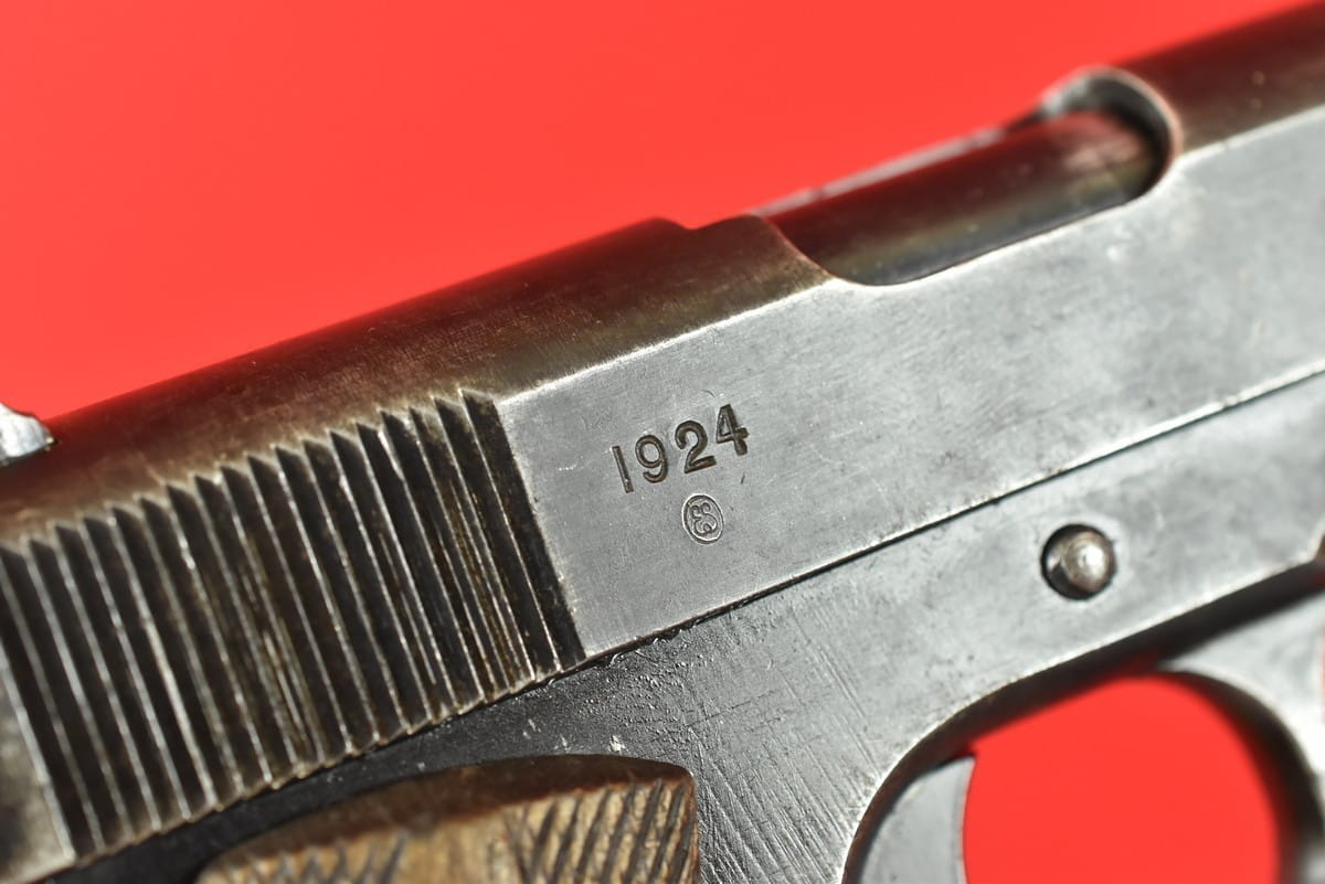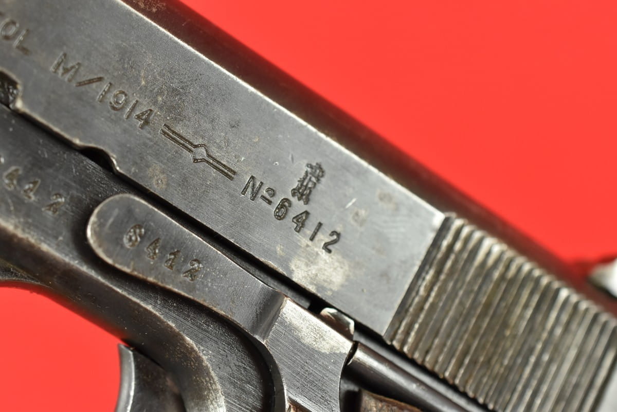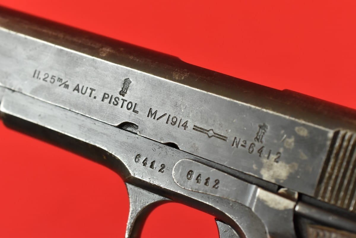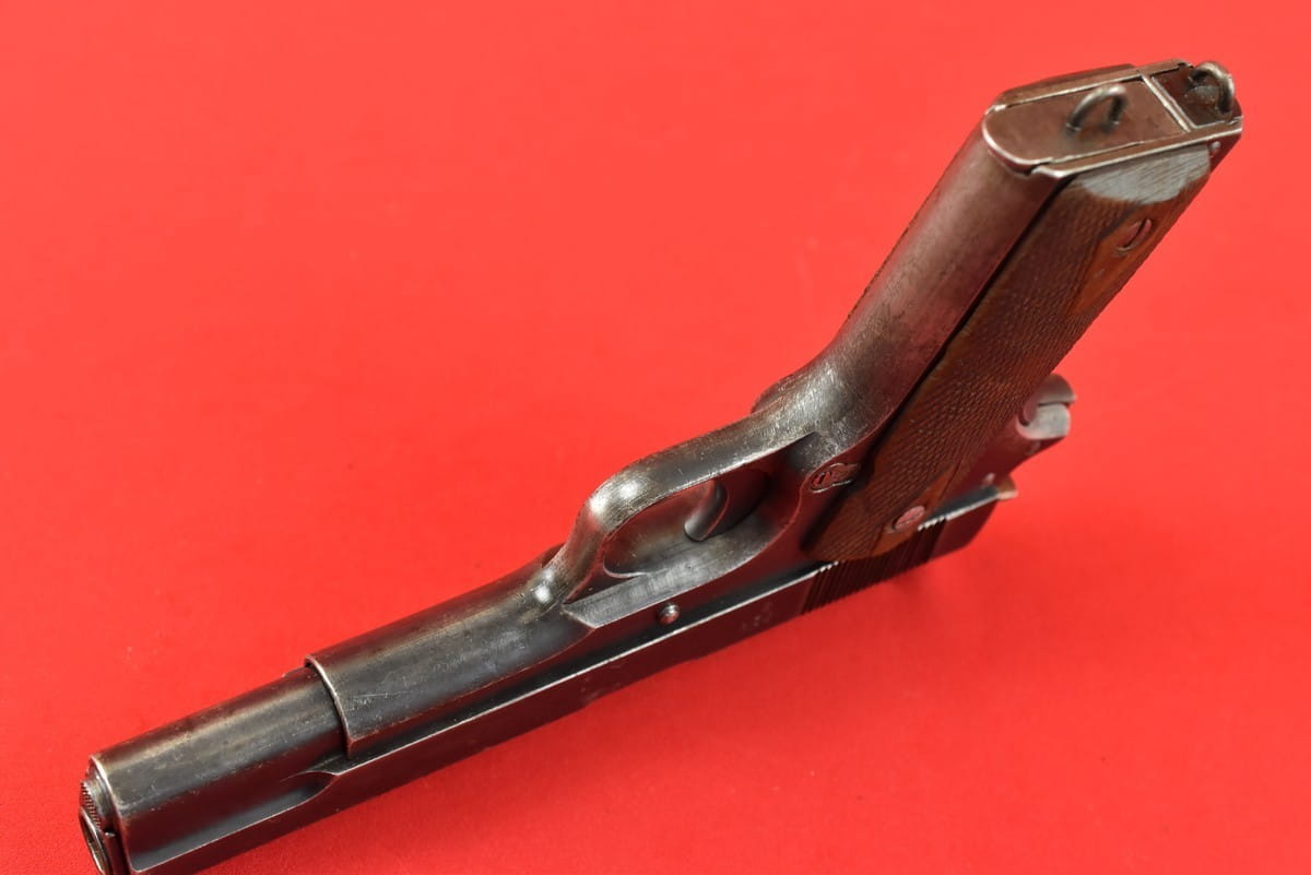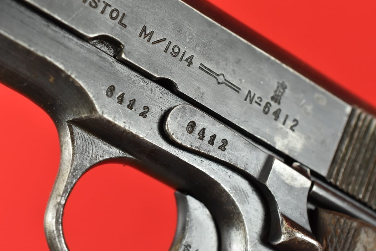#1945 Pistolet m/1914 potocznie zwany Coltem Kongsberg. Kal. 45ACP. Produkcja norweska z roku 1924. Pistolety tego typu produkcji przedwojennej, okupacyjnej oraz powojennej - były aktywnie używane w Norwegii aż do roku 1994 (ostatnia formacja to MW), a następnie przeszły do demobilu - albo do dalszego składowania. Przewód lufy - gwint ostry, wyraźny, w niektórych miejscach widoczne drobne wżery. Podczas tak długiego okresu eksploatacji pistolety te miały często wiele razy do czynienia z remontami czy naprawami - co wiązało się z wymianą uszkodzonych części, oraz prawie zawsze - z ponownym przeoksydowaniem - tak jak i w tym wypadku. Egzemplarze w fabrycznej oksydzie są niezmiernie rzadkie.