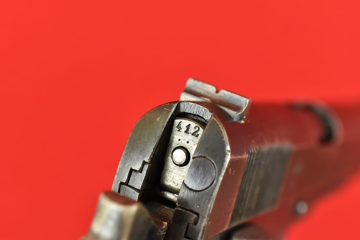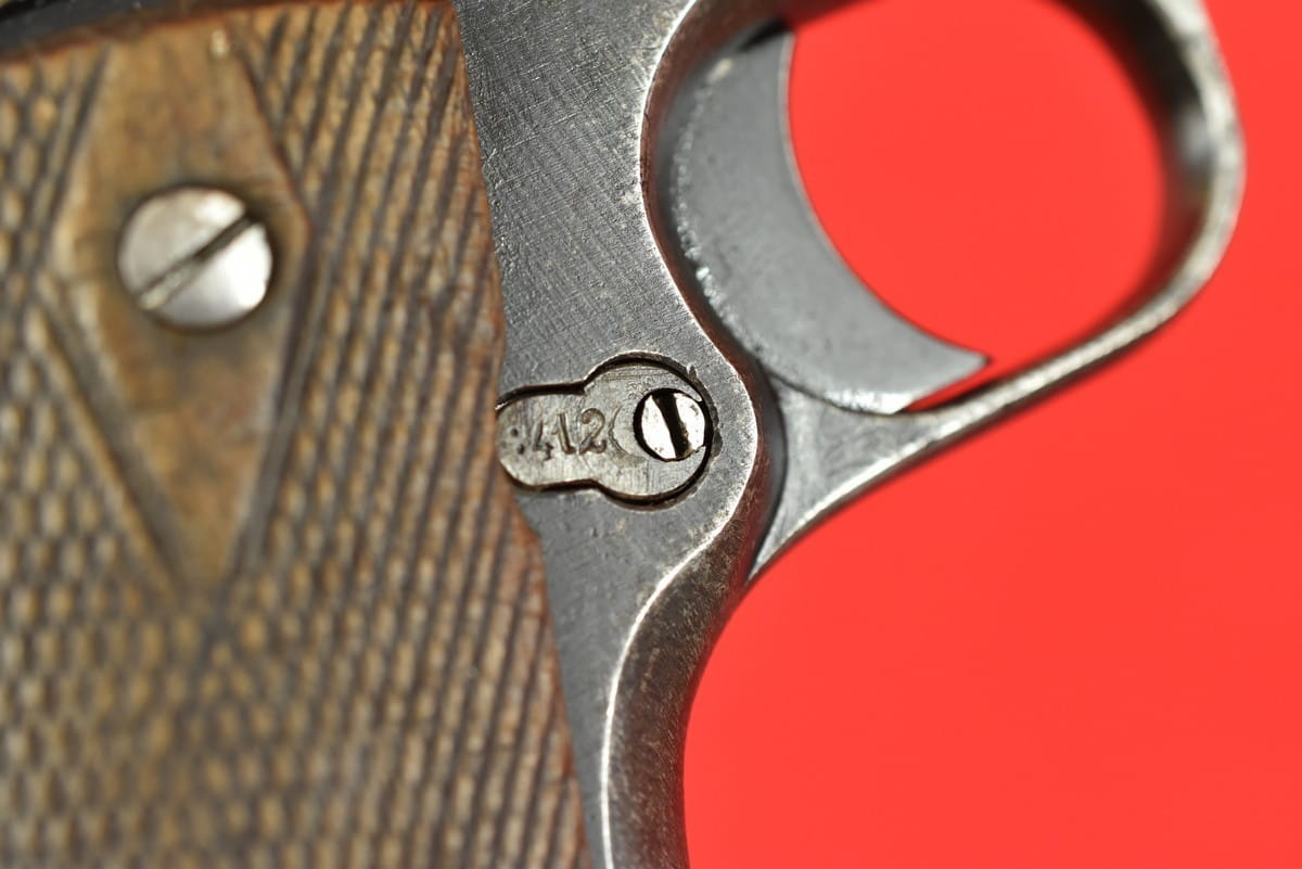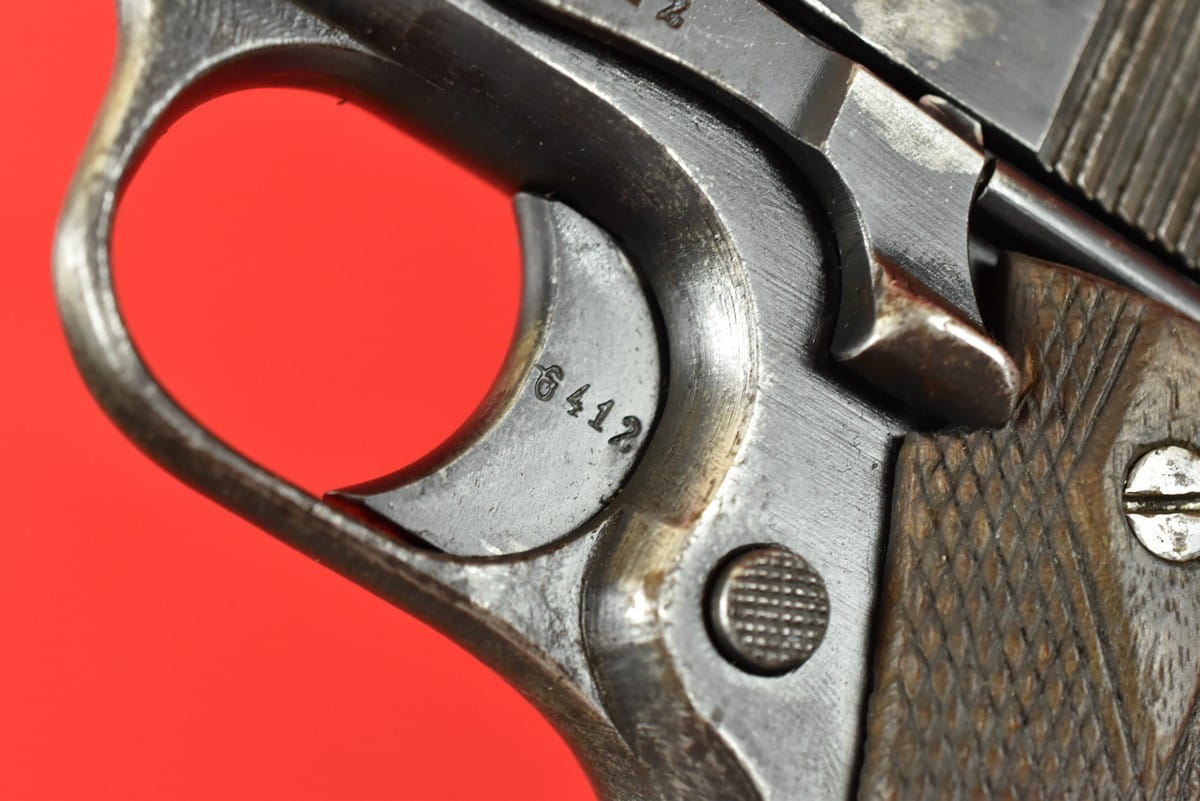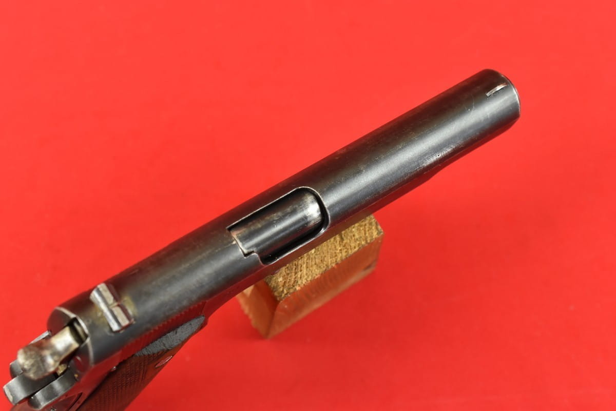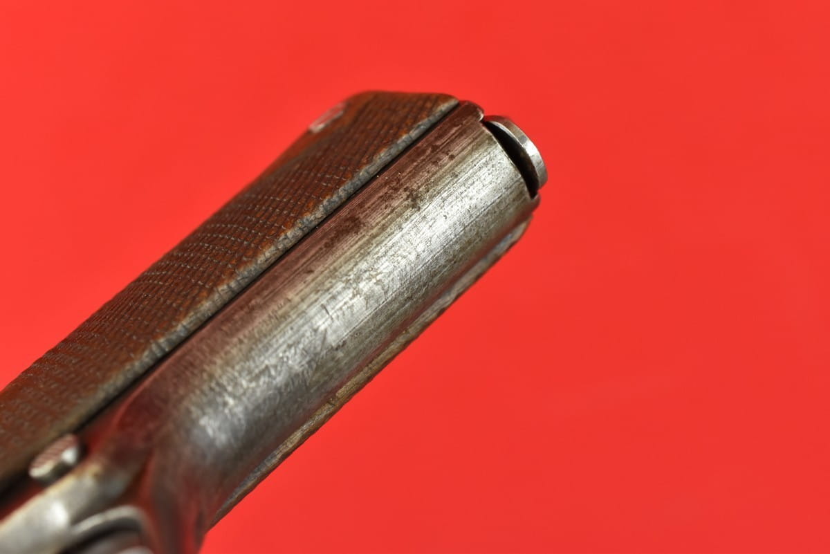 #1945 Pistolet m/1914 potocznie zwany Coltem Kongsberg. Kal. 45ACP. Produkcja norweska z roku 1924. Pistolety tego typu produkcji przedwojennej, okupacyjnej oraz powojennej - były aktywnie używane w Norwegii aż do roku 1994 (ostatnia formacja to MW), a następnie przeszły do demobilu - albo do dalszego składowania. Przewód lufy - gwint ostry, wyraźny, w niektórych miejscach widoczne drobne wżery. Podczas tak długiego okresu eksploatacji pistolety te miały często wiele razy do czynienia z remontami czy naprawami - co wiązało się z wymianą uszkodzonych części, oraz prawie zawsze - z ponownym przeoksydowaniem - tak jak i w tym wypadku. Egzemplarze w fabrycznej oksydzie są niezmiernie rzadkie.