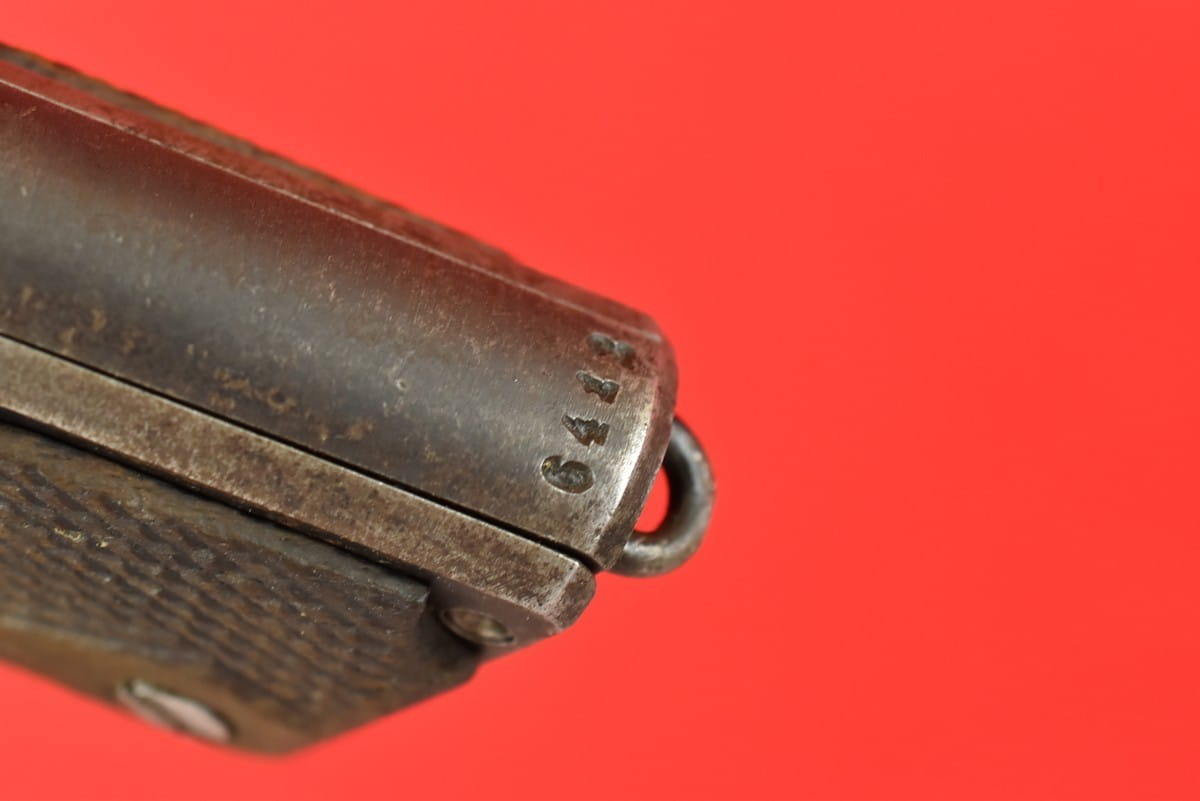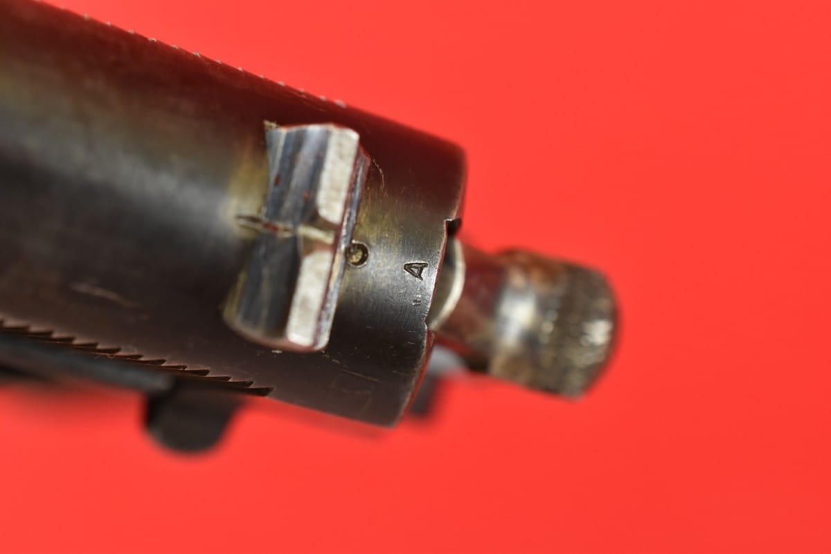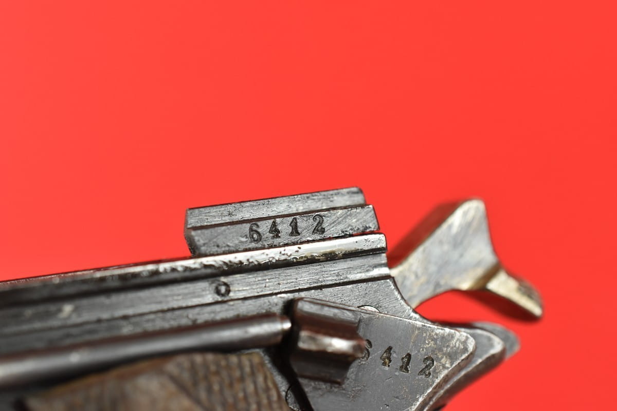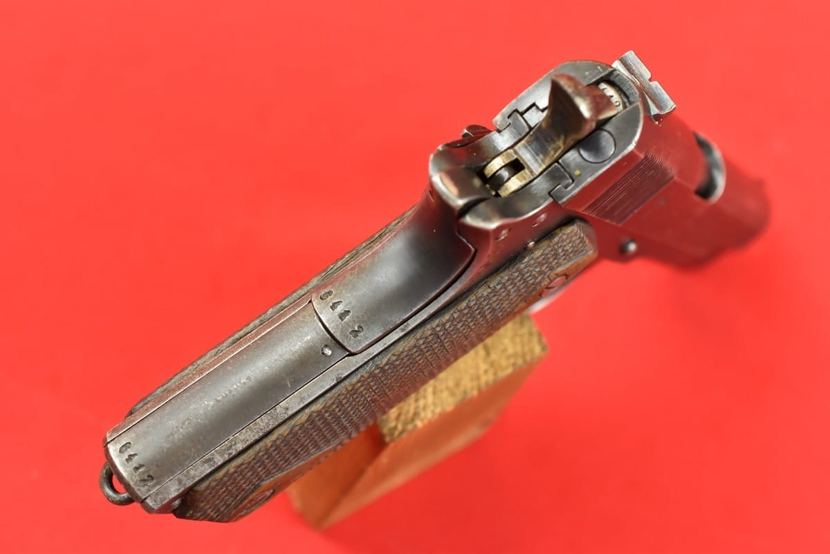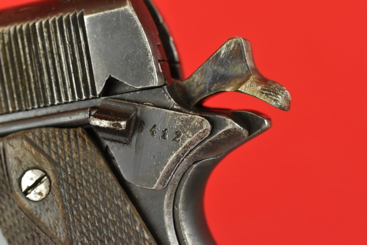 #1945 Pistolet m/1914 potocznie zwany Coltem Kongsberg. Kal. 45ACP. Produkcja norweska z roku 1924. Pistolety tego typu produkcji przedwojennej, okupacyjnej oraz powojennej - były aktywnie używane w Norwegii aż do roku 1994 (ostatnia formacja to MW), a następnie przeszły do demobilu - albo do dalszego składowania. Przewód lufy - gwint ostry, wyraźny, w niektórych miejscach widoczne drobne wżery. Podczas tak długiego okresu eksploatacji pistolety te miały często wiele razy do czynienia z remontami czy naprawami - co wiązało się z wymianą uszkodzonych części, oraz prawie zawsze - z ponownym przeoksydowaniem - tak jak i w tym wypadku. Egzemplarze w fabrycznej oksydzie są niezmiernie rzadkie.