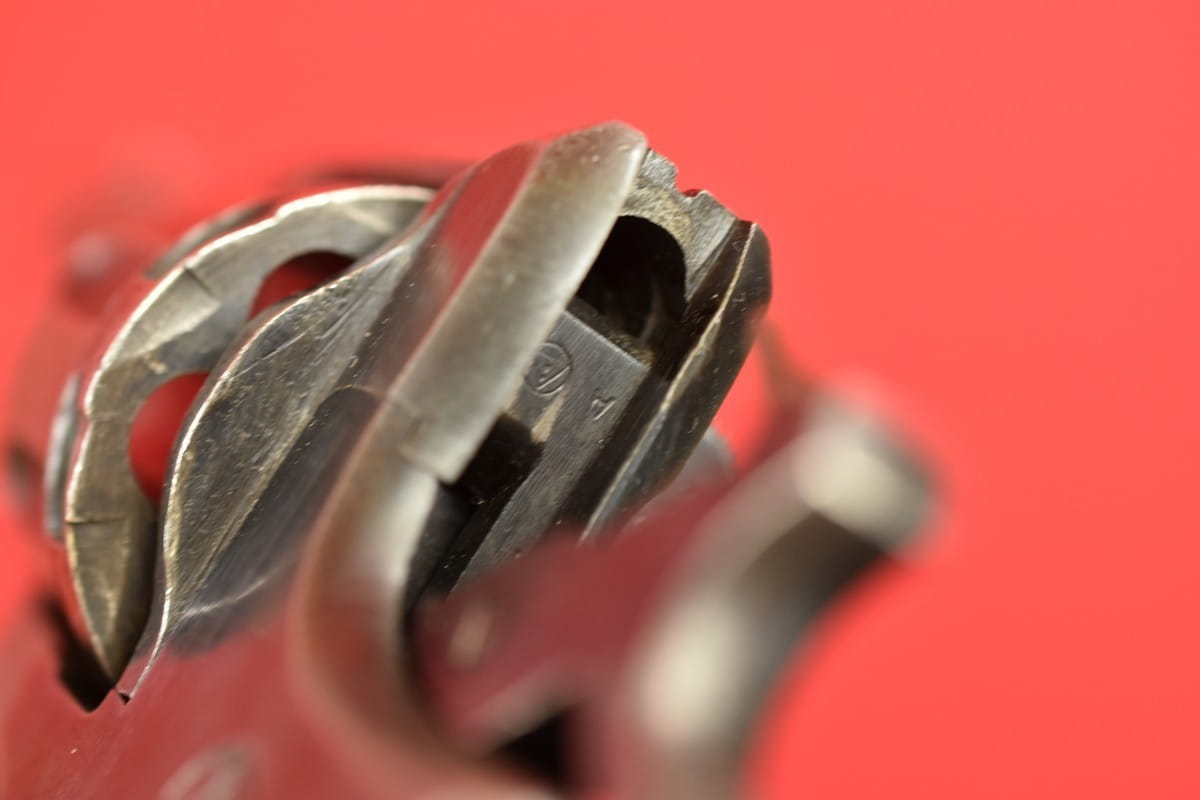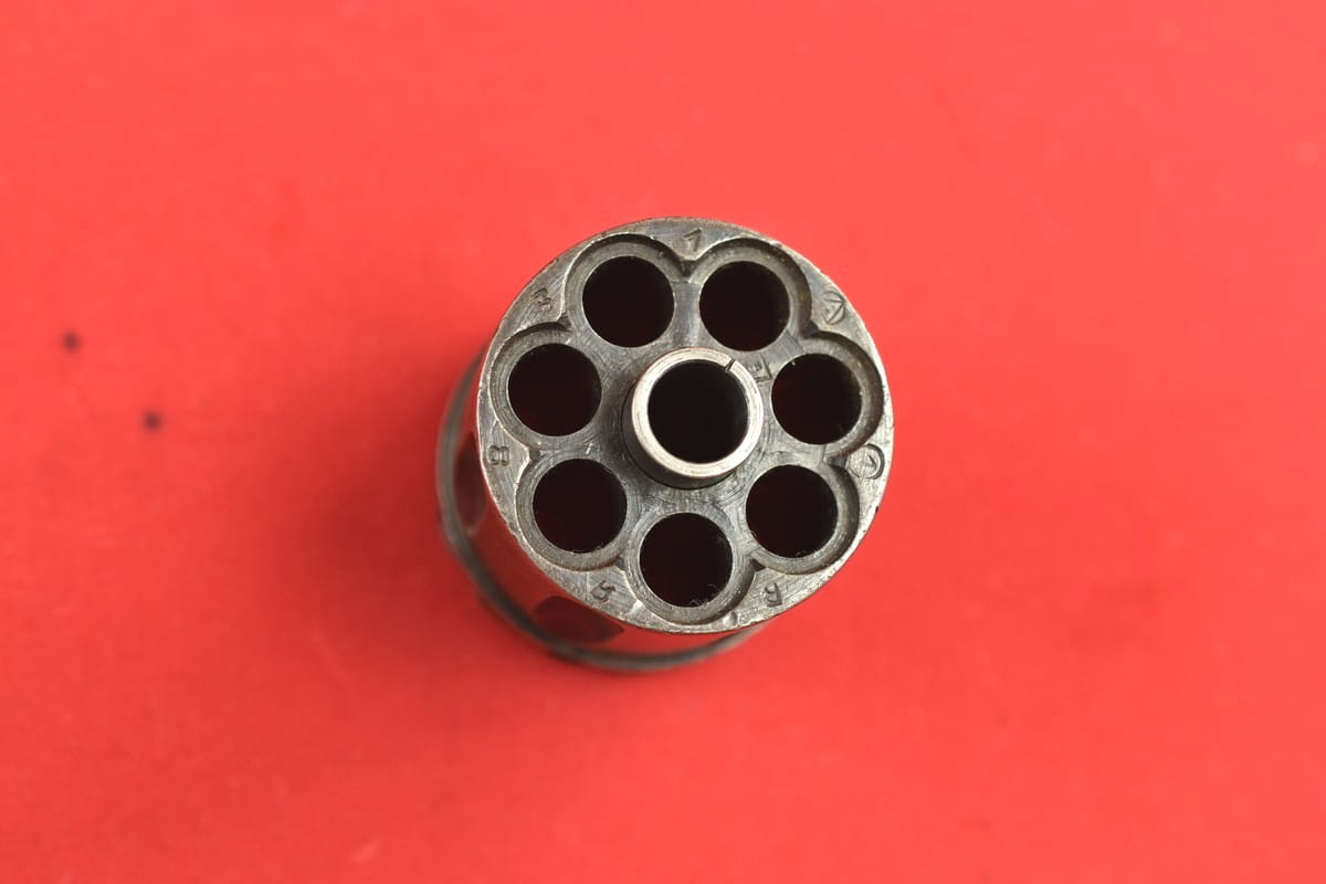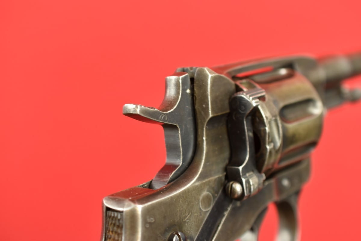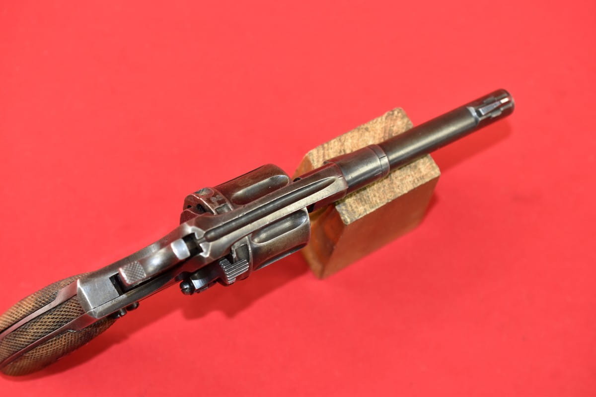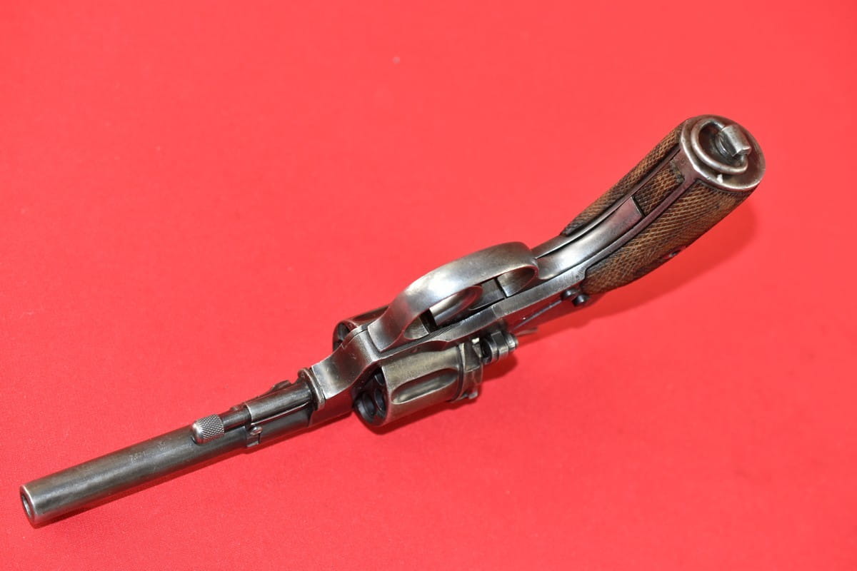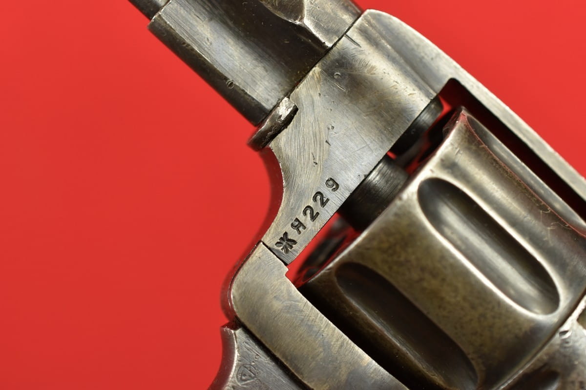 #2649 Rewolwer Nagant M95 kal. 7,62 Nagant. Produkcja zakładów w Iżewsku z roku 1943. Niezgodny numerycznie - bęben jest również produkcji Iżewska (widoczne logo) - ale ma inny numer. Oksyda oryginalna, wojenna, biedna, a powierzchnie z widoczną obróbką. Egzemplarz nie remontowany po wojnie. Przewód lufy w stanie złym - gwint wyraźny na całej długości, ale przewód w całości jest pokryty silnymi wżerami. Oczywiście można z niego jak najbardziej strzelać, choć bardziej nadaje się do kolekcji. Wariant z samonapinaniem.