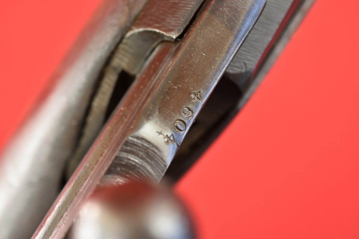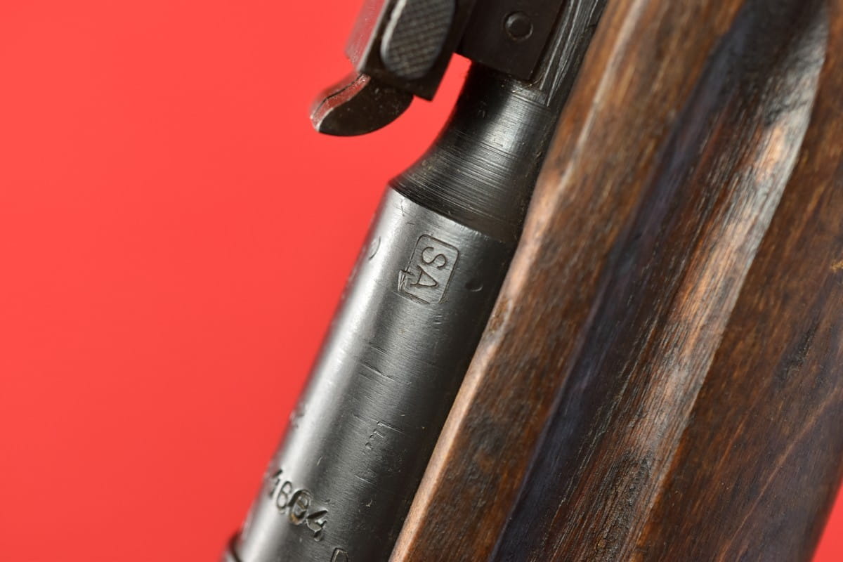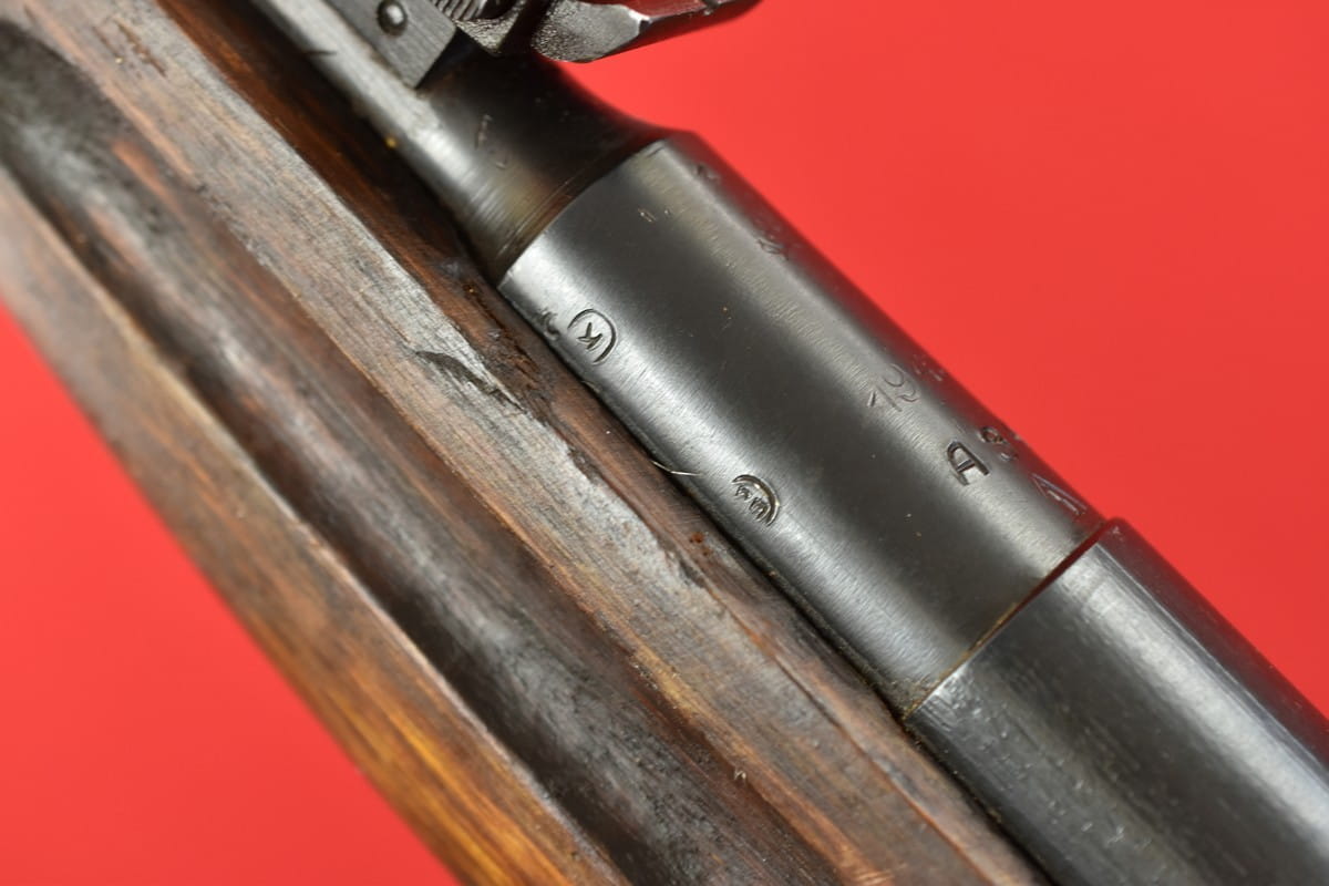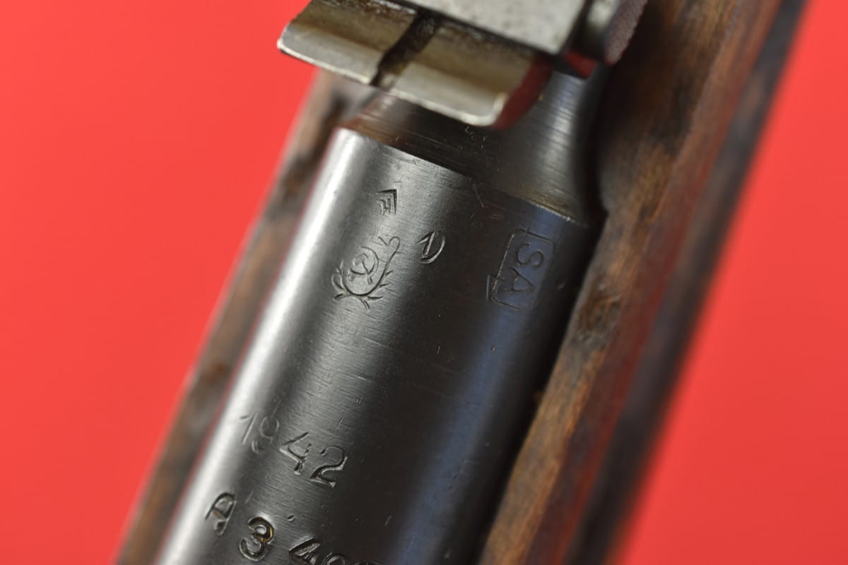 Przewód lufy w stanie słabym - gwint widać wyraźnie, cały pokryty jest jednak wżerami. Na lufie widać numer seryjny, "SA" (Suomen Armeija), literę "D" (przystosowanie do D166), oznaczenie producenta (Iżewsk), datę produkcji 1942.