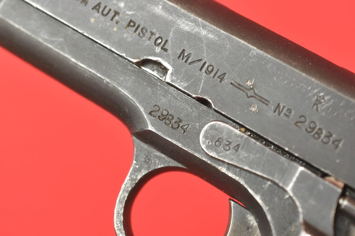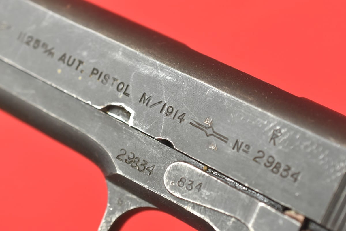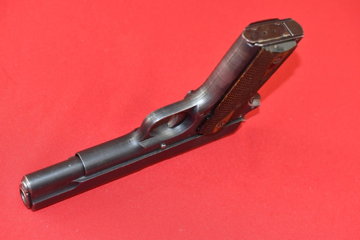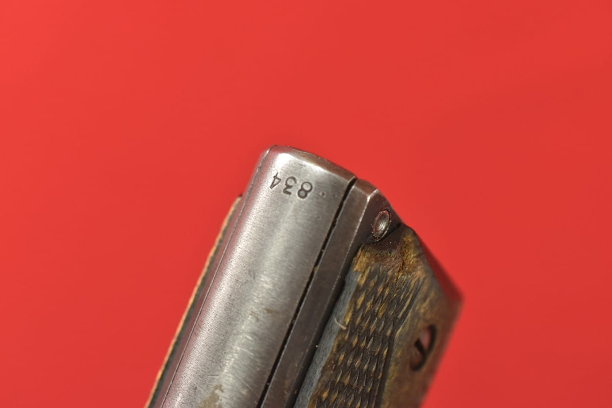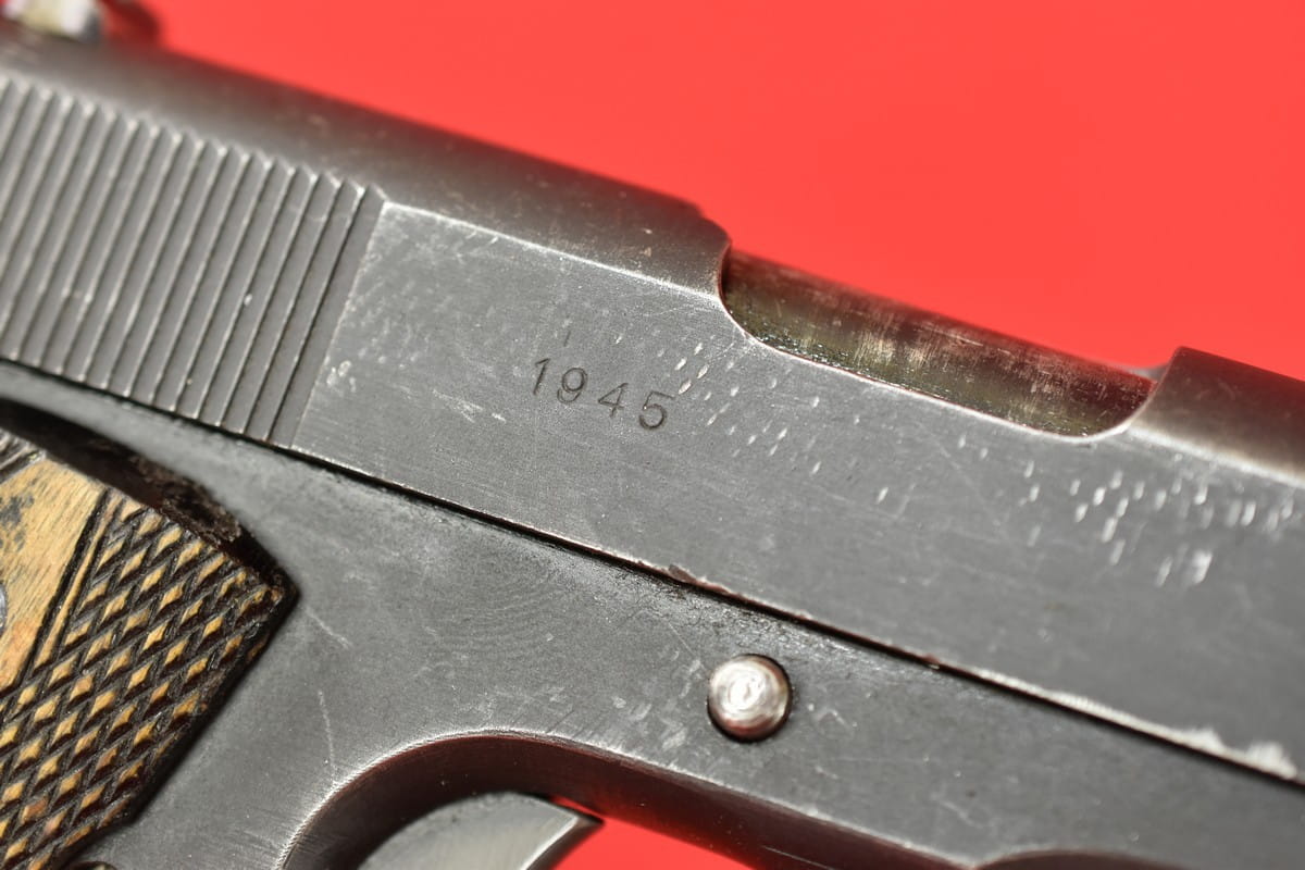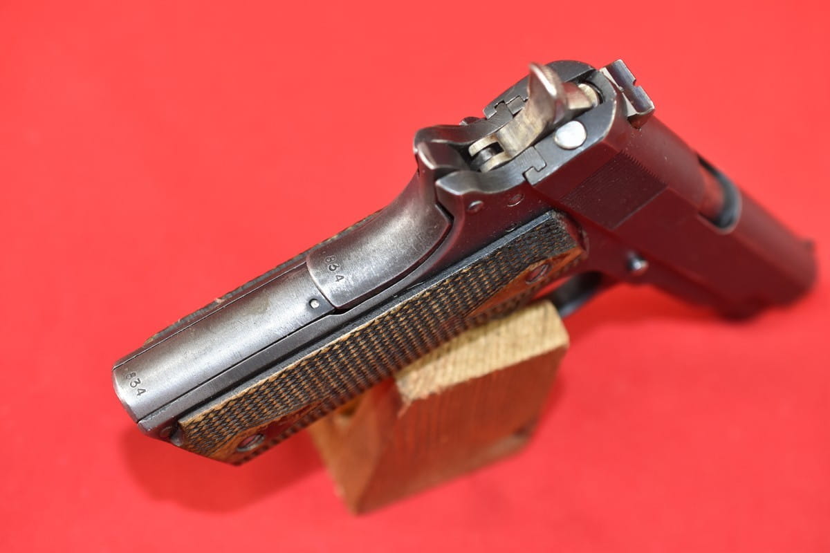 #3635 Pistolet m/1914 - potocznie zwany Coltem Kongsberg. Kal. 45ACP. Produkcja z roku 1945 - z ostatniej partii bardzo rzadko spotykanych niemieckich Kongsbergów z odbiorem WaA84 (920 sztuk) wyprodukowanych w roku 1945 r. Zakres numeryczny to 29621-30523. Egzemplarz niewątpliwie autentyczny - nie przerobiony z pistoletu produkcji powojennej! Oferowany egzemplarz ma numer seryjny 29834. Gdyby ktoś obawiał się jednak genialnej podróbki - w sieci można znaleźć dobre fotki innych oryginalnych egzemplarzy. Dokładne porównanie niezbicie wykazuje na oryginalność naszego egzemplarza - już abstrahując od źródła pochodzenia.