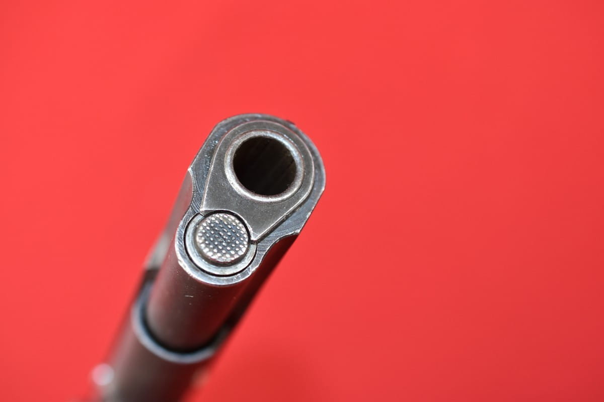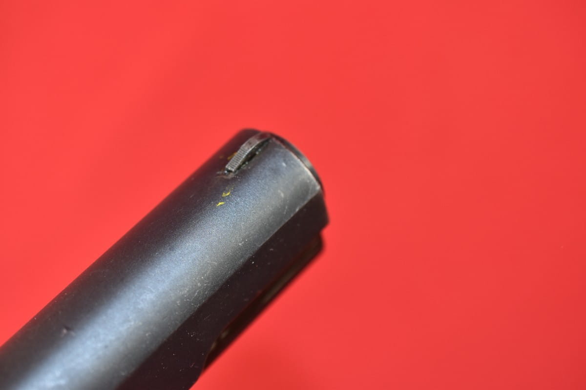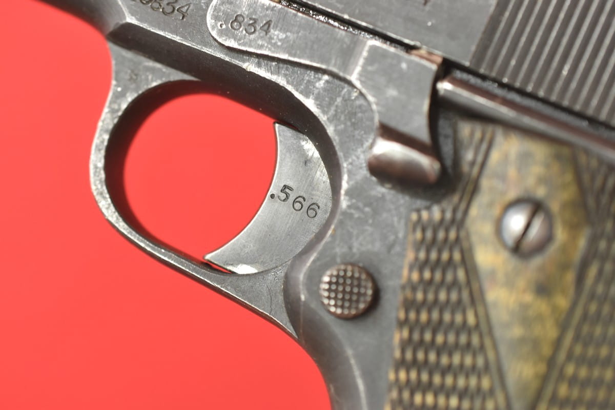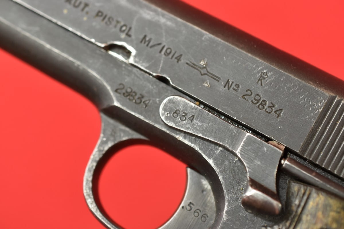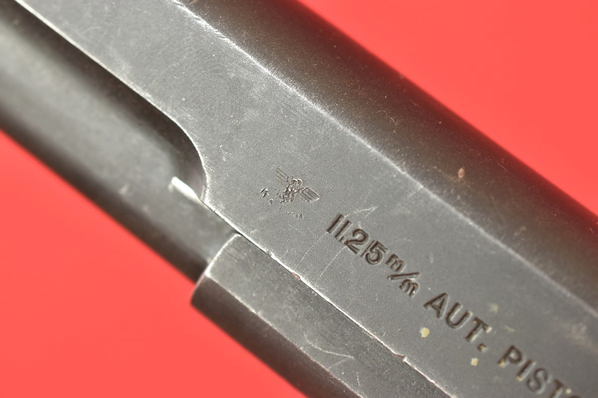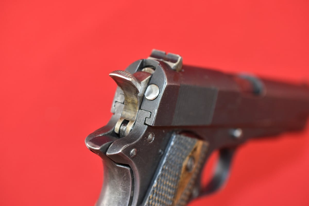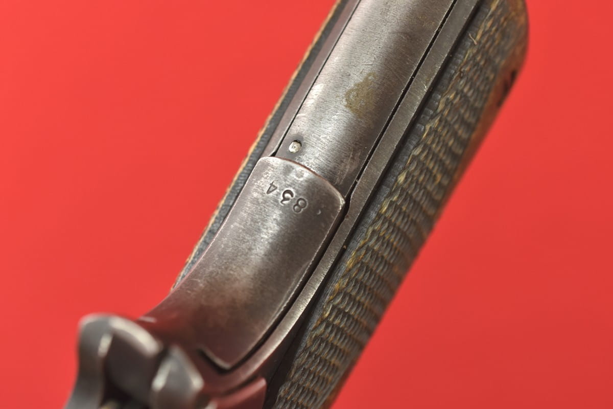#3635 Pistolet m/1914 - potocznie zwany Coltem Kongsberg. Kal. 45ACP. Produkcja z roku 1945 - z ostatniej partii bardzo rzadko spotykanych niemieckich Kongsbergów z odbiorem WaA84 (920 sztuk) wyprodukowanych w roku 1945 r. Zakres numeryczny to 29621-30523. Egzemplarz niewątpliwie autentyczny - nie przerobiony z pistoletu produkcji powojennej! Oferowany egzemplarz ma numer seryjny 29834. Gdyby ktoś obawiał się jednak genialnej podróbki - w sieci można znaleźć dobre fotki innych oryginalnych egzemplarzy. Dokładne porównanie niezbicie wykazuje na oryginalność naszego egzemplarza - już abstrahując od źródła pochodzenia.