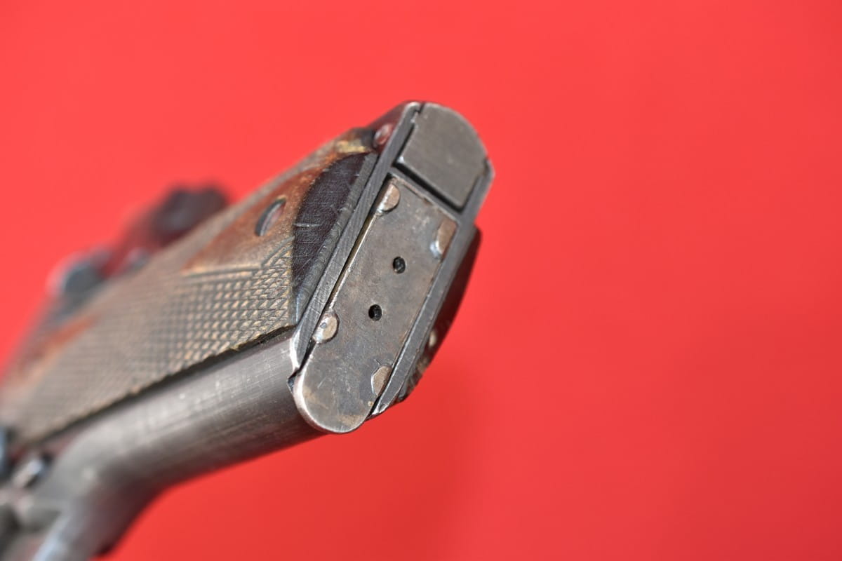 UWAGA - magazynek jest w 100% oryginalny i odpowiedni do tej serii pistoletów! Tak, ma byle jak przyspawane denko, dół korpusu magazynka jest przepalony, okopcony od spawów - a w samym denku widać dwa otwory na ucho smyczy. Tak właśnie wygląda i ma wyglądać magazynek do Colta Kongsberga z końca okupacji niemieckiej. Nie jest to żadna "naprawa" czy fantazja. Polecamy książkę Karla Hanevika "Kongsberg-Colten" - niestety, tylko po norwesku - ale i tak jest kopalnią informacji.