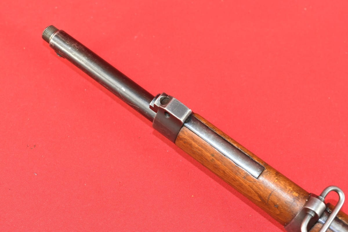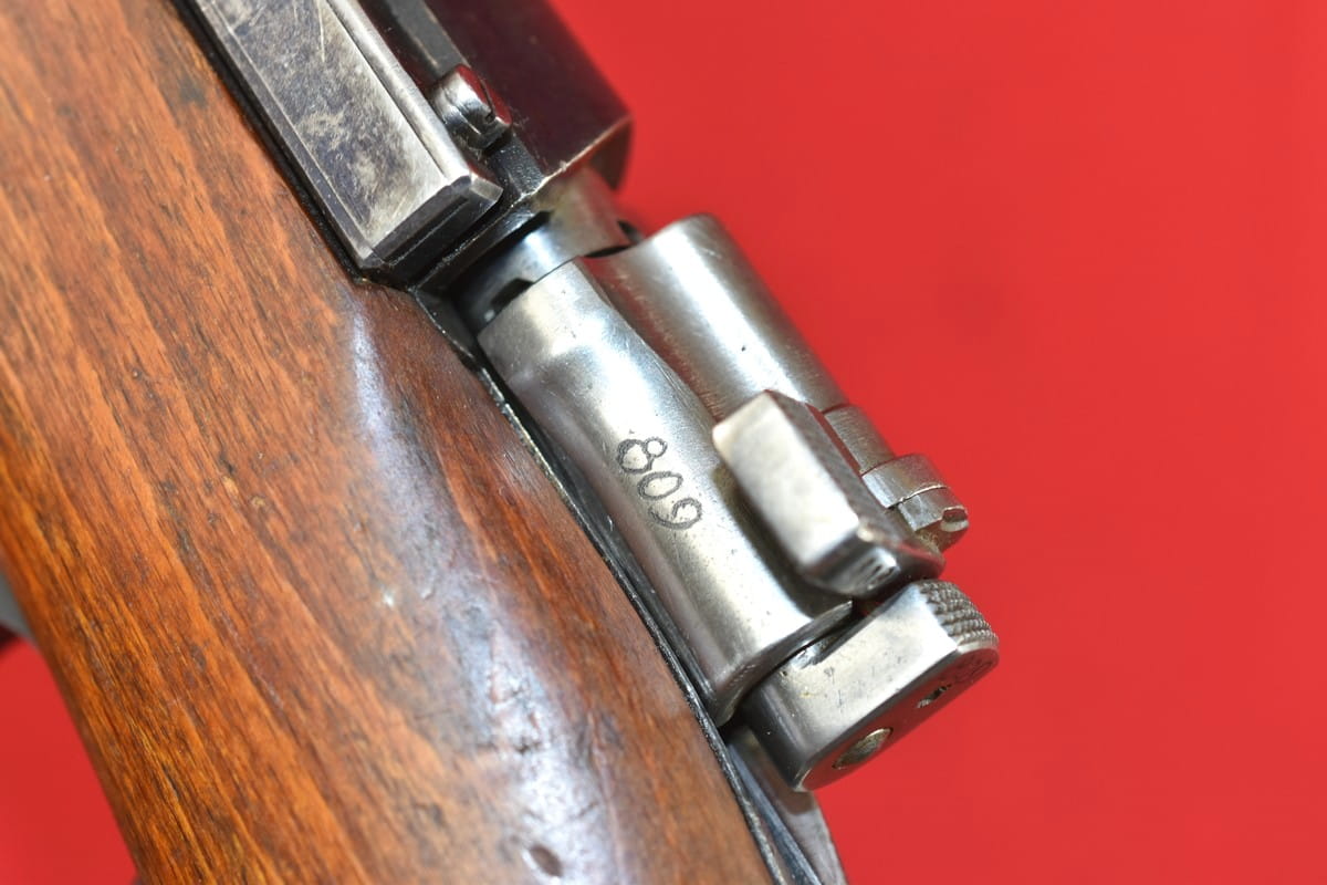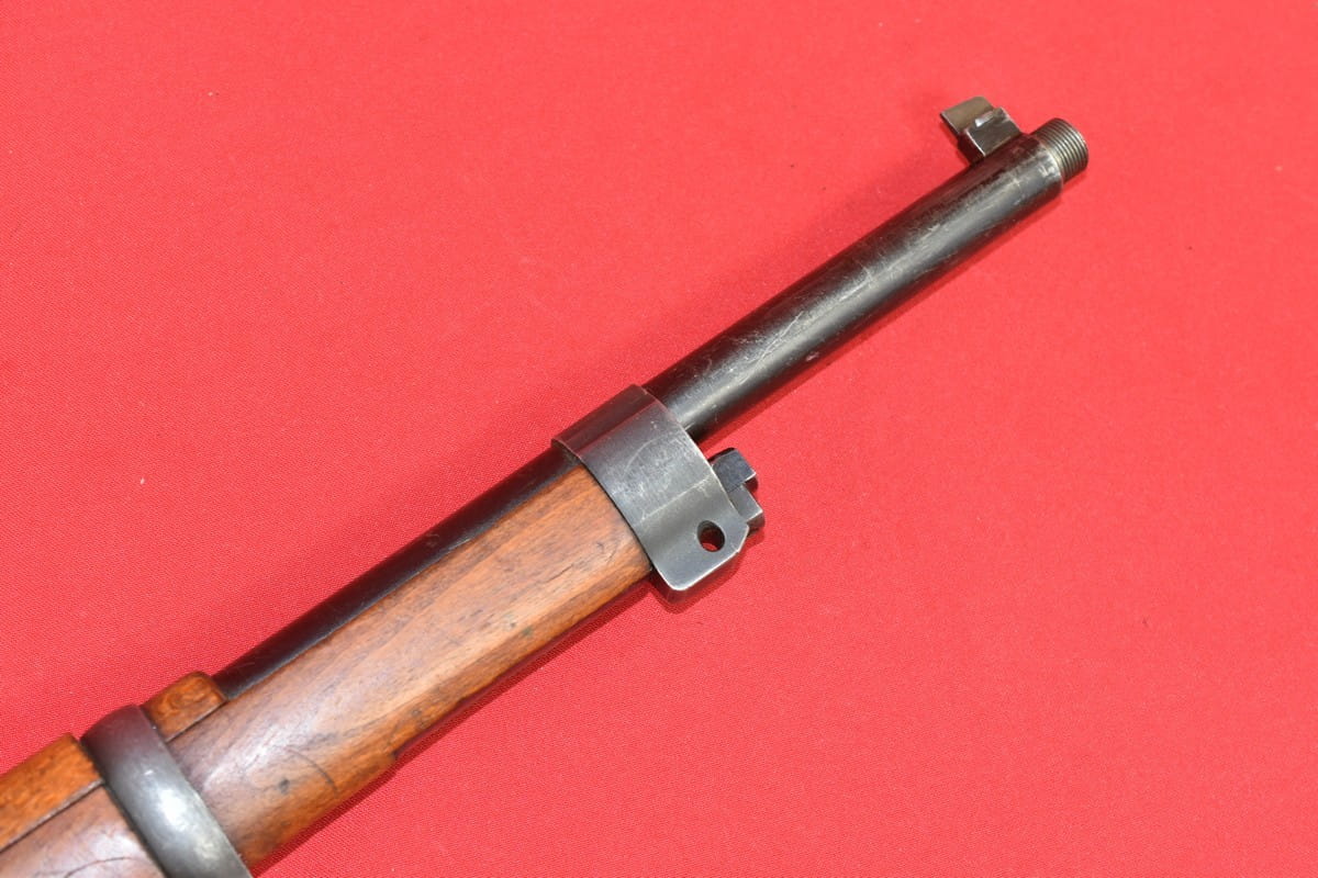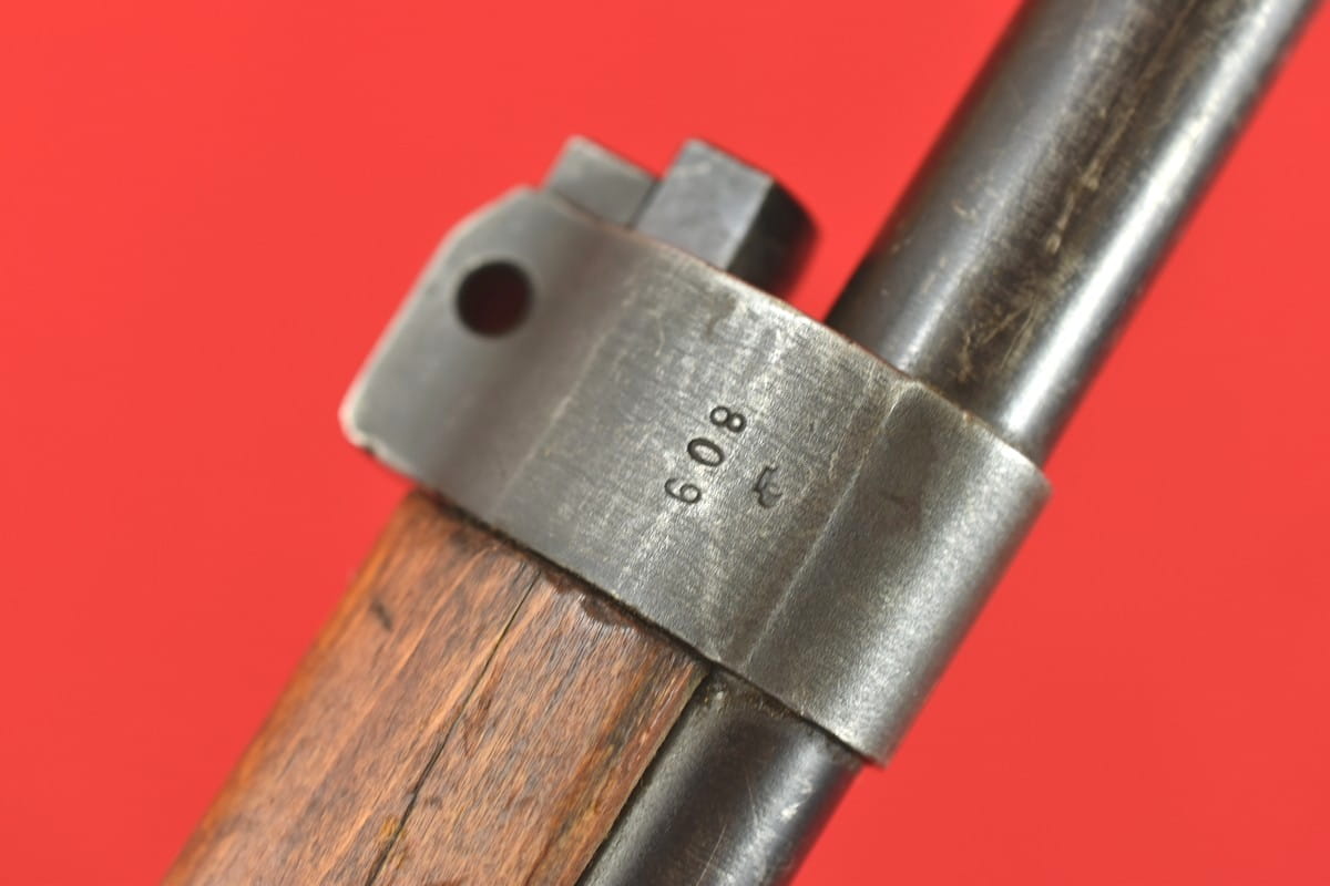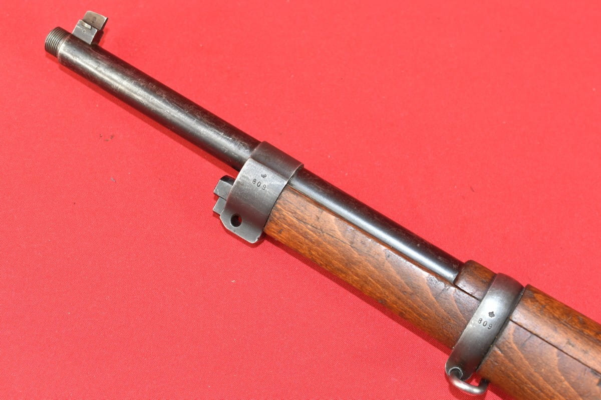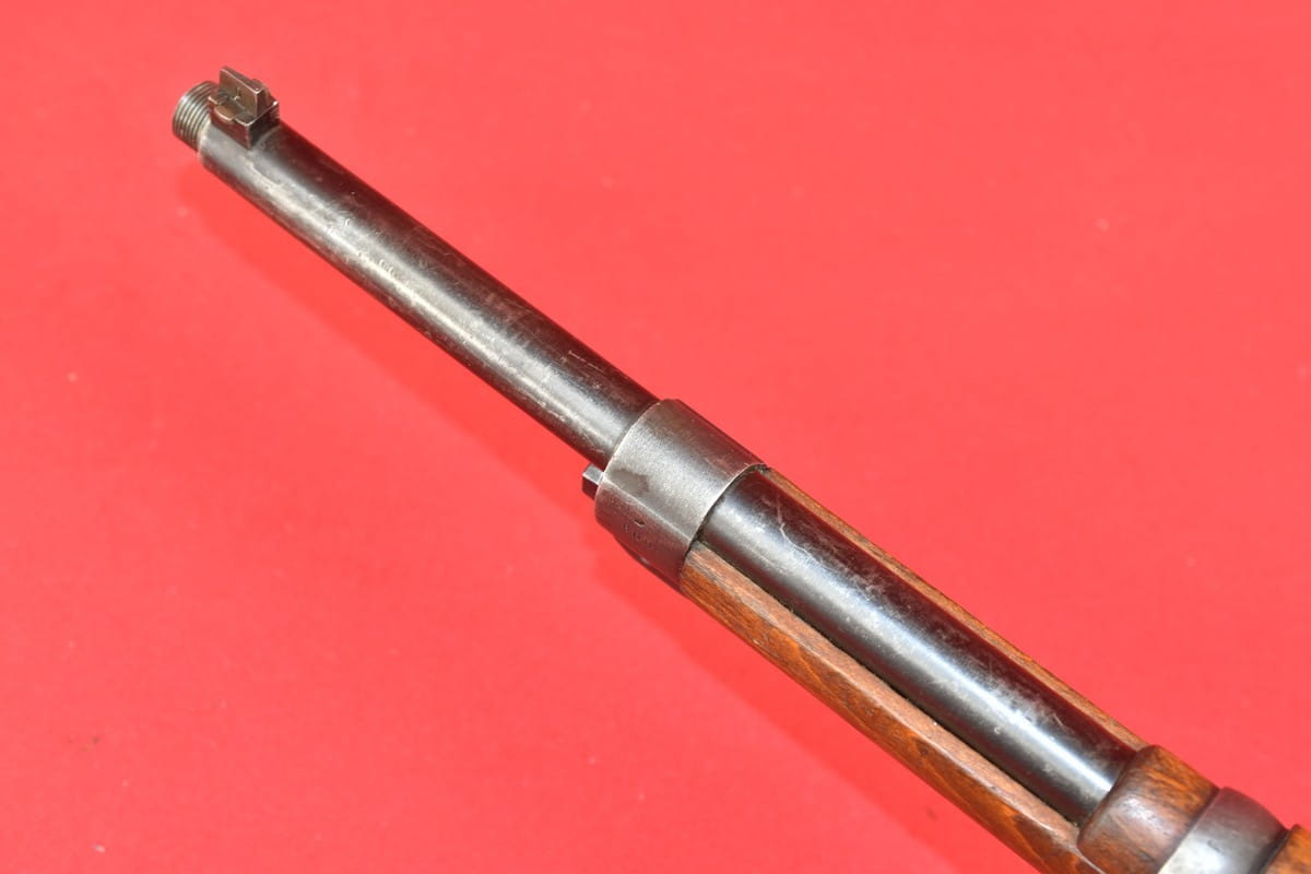 #4356 Karabinek Mauser m/96-38 armii szwedzkiej. Kal. 6,5x55. Przerobiony z egzemplarza wyprodukowanego w roku 1899. Końcówka lufy z gwintem pod urządzenie do ślepego strzelania. Broń z takim gwintem była oznaczana sufiksem "B" - czyli w tym wypadku pełne oznaczenie wzoru to m/96-38B.