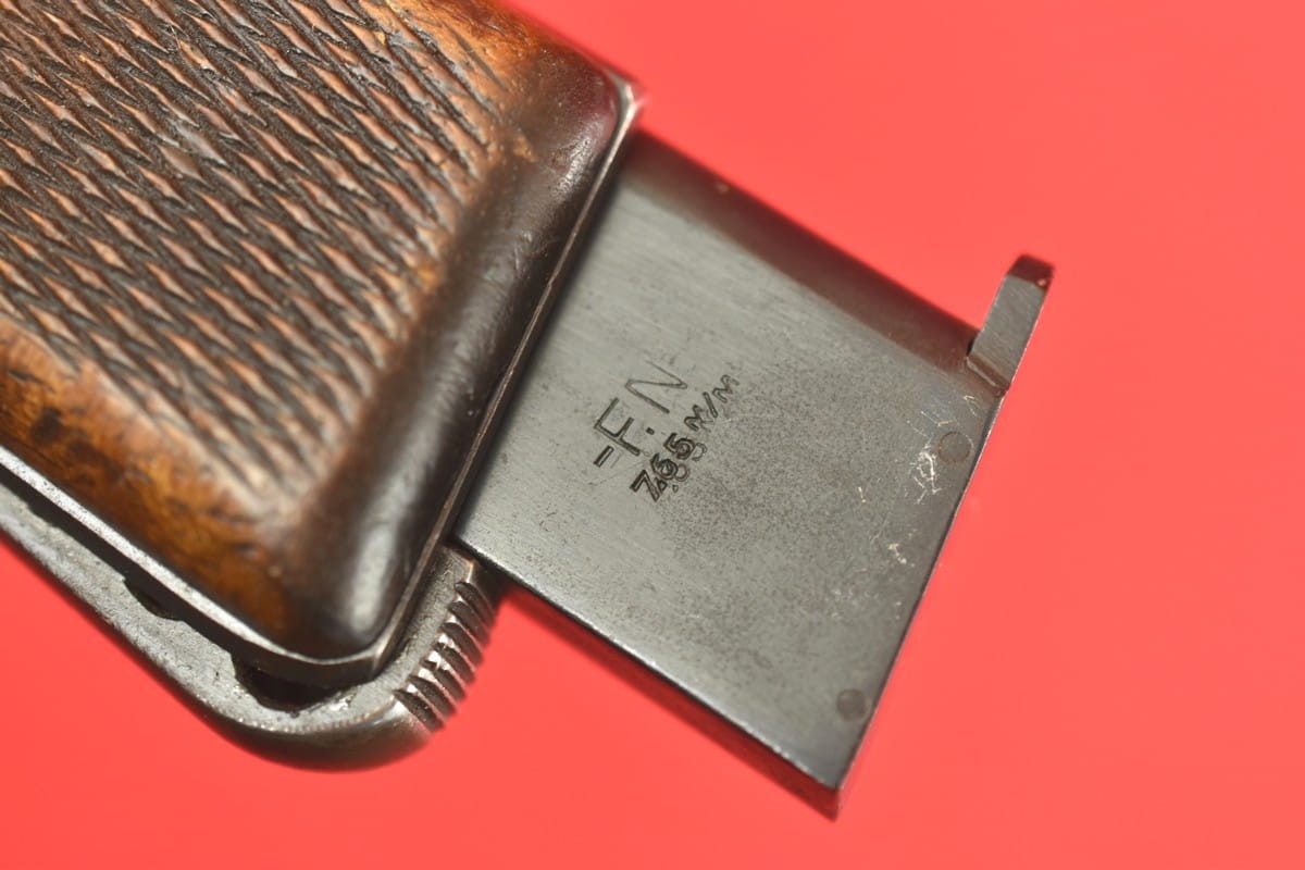 Bardzo wczesny, powojenny egzemplarz wyprodukowany w roku 1945 na zamówienie armii belgijskiej (przedział numeryczny: A90001 - A97700). Wojskowy odbiór belgijski obecny jest na kabłąku (litery AC). Ponieważ FN odzyskało możliwość produkcji części dopiero w roku 1946 - do tej pory przy produkcji korzystano wyłącznie z części poniemieckiej produkcji. Tak jest i w tym wypadku - pierwsze, co rzuca się w oczy, to poniemieckie, drewniane okładziny.