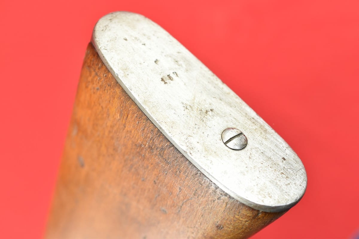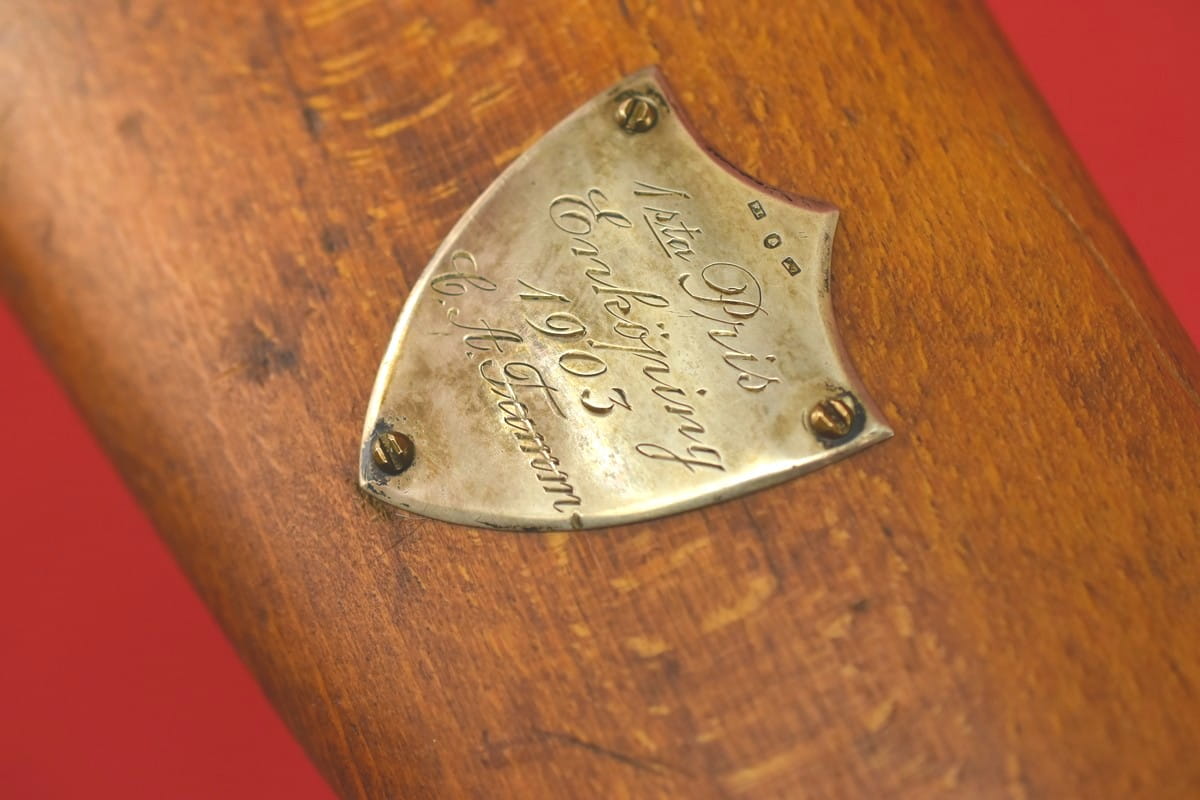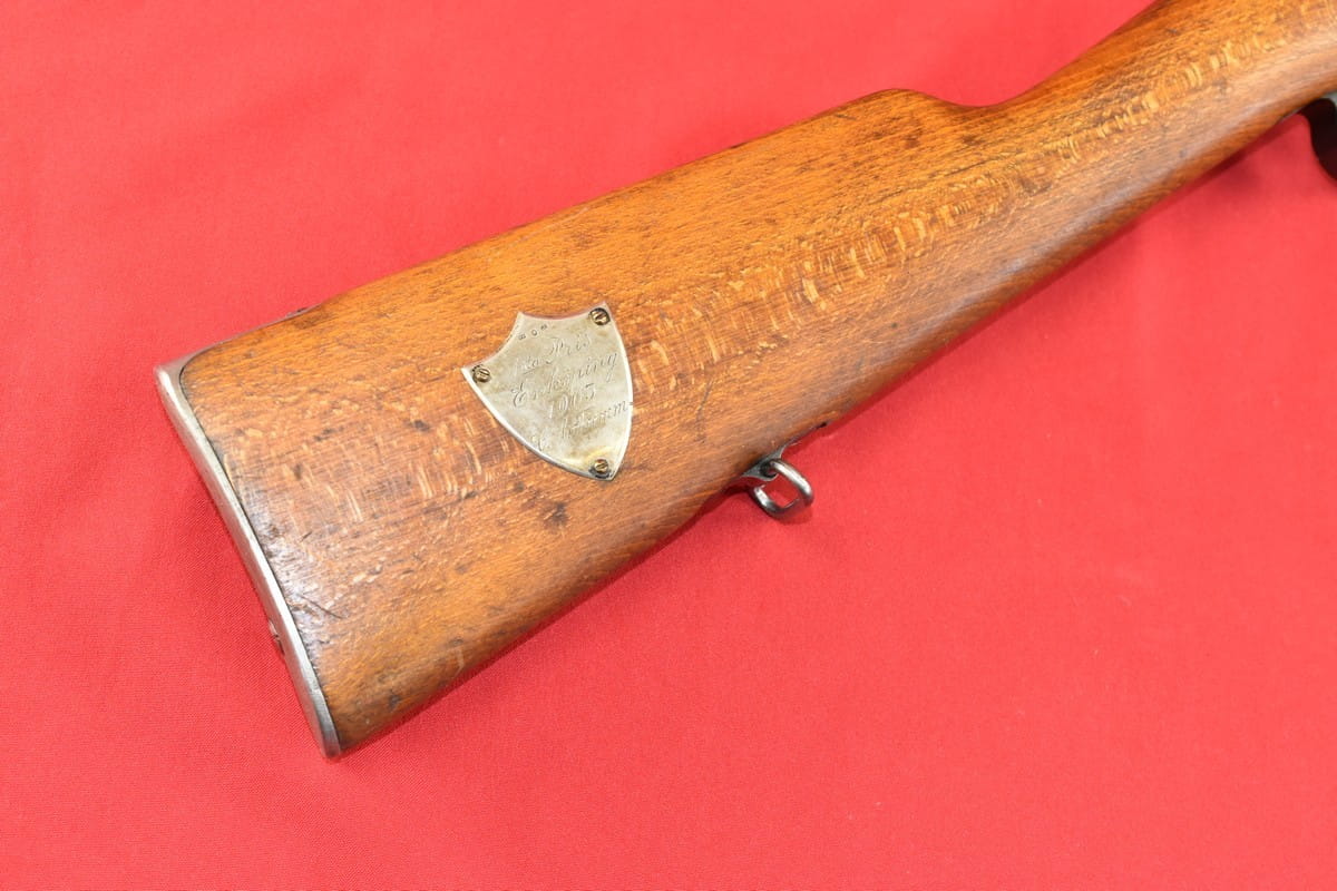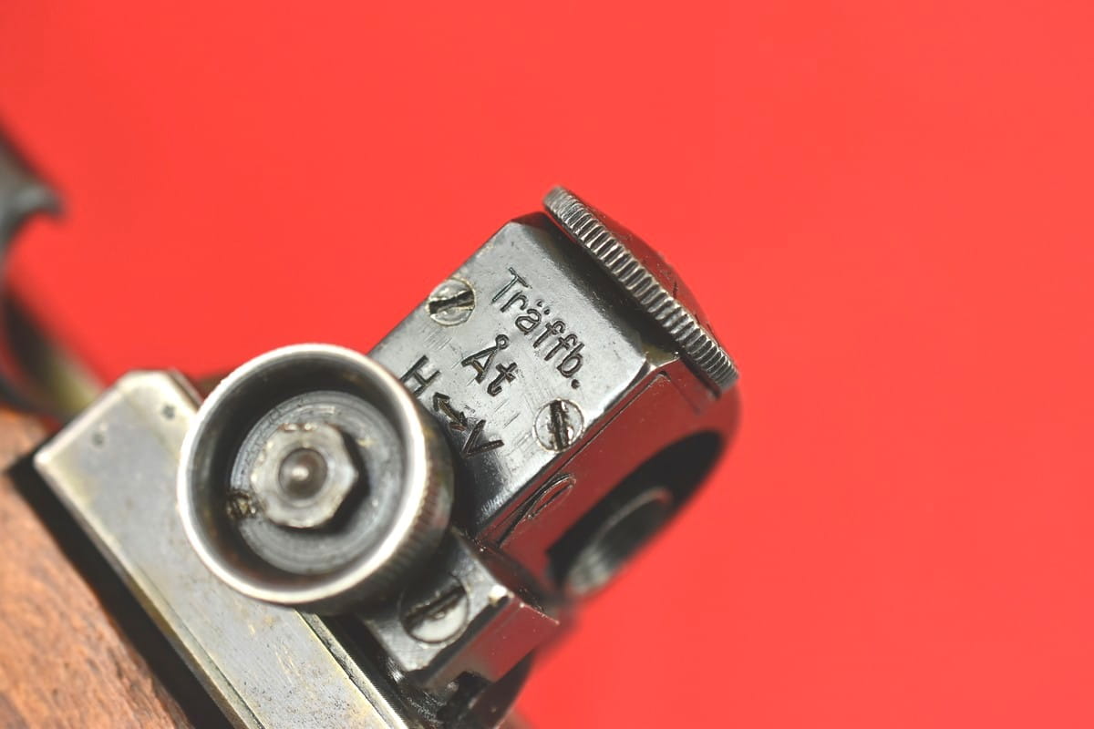 #4852 Karabin Mauser m/96 - etatowy karabin armii szwedzkiej. Kaliber 6,5x55, fabryka Carl Gustaf, rok produkcji 1900. Egzemplarz przystosowany do strzelania sportowego, wyposażony w klasyczny diopter Söderin. Na kolbie srebrna plakietka nagrodowa (jest próba) za zajęcie pierwszego miejsca na zawodach w Enköpping w roku 1903 - wraz z nazwiskiem zwycięzcy.