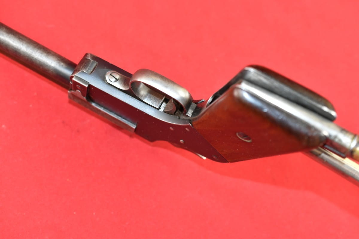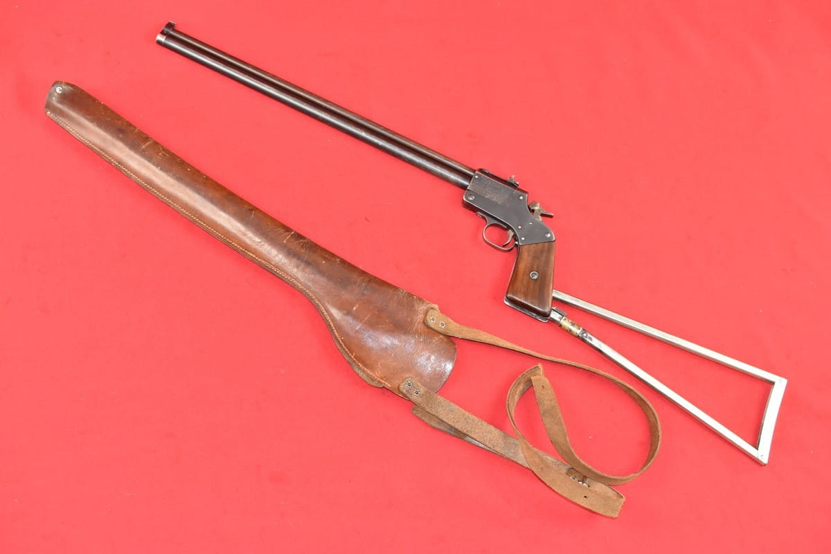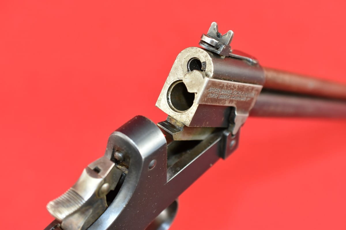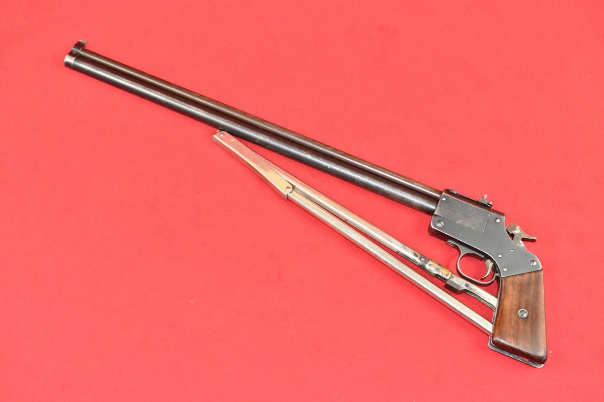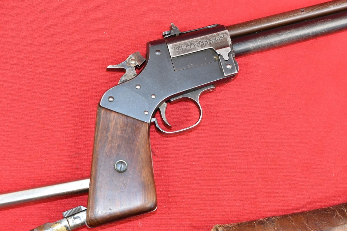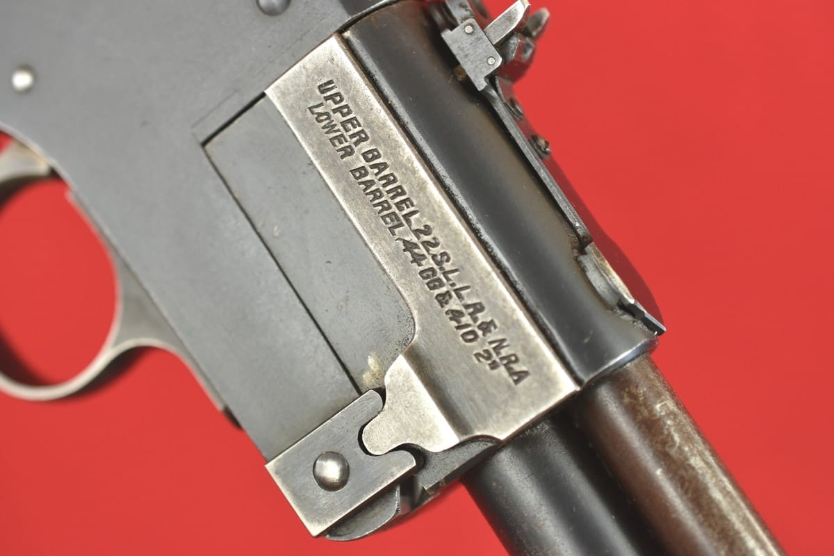 #5052 Dwulufowy pistolet Marble Game Getter Model 1921 - kal. 22lr / 410 bore. Produkcja amerykańska. Generalnie produkcja tego modelu skończyła się w okresie II wojny światowej - ale niewielkie ilości złożono jeszcze po wojnie, np. na rynek kanadyjski. Numer seryjny 14490 wskazuje jednak na okres przedwojenny.