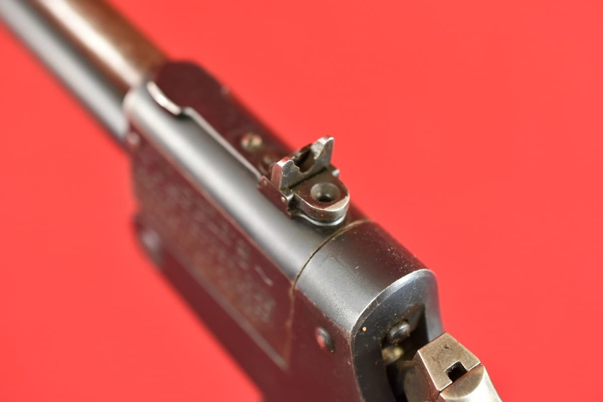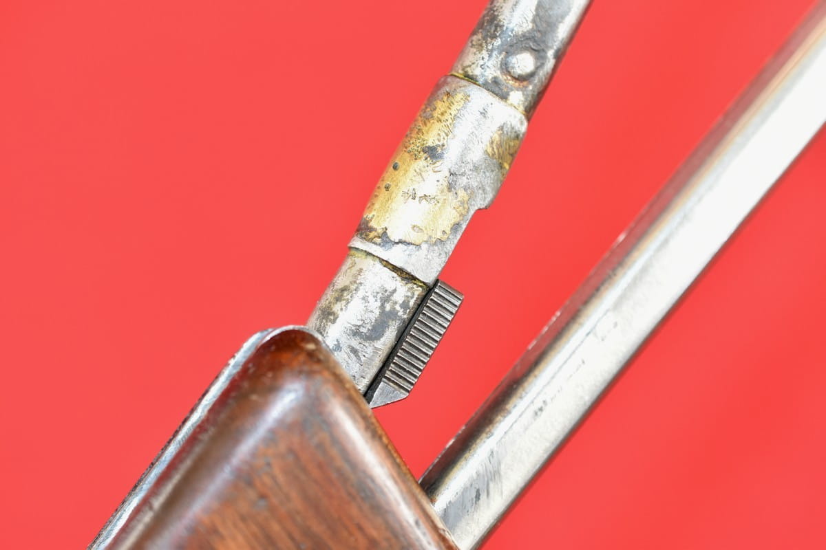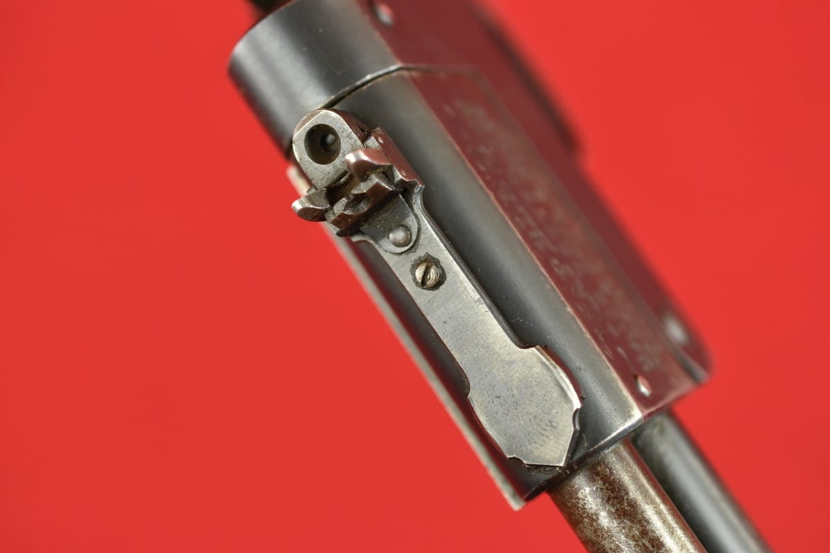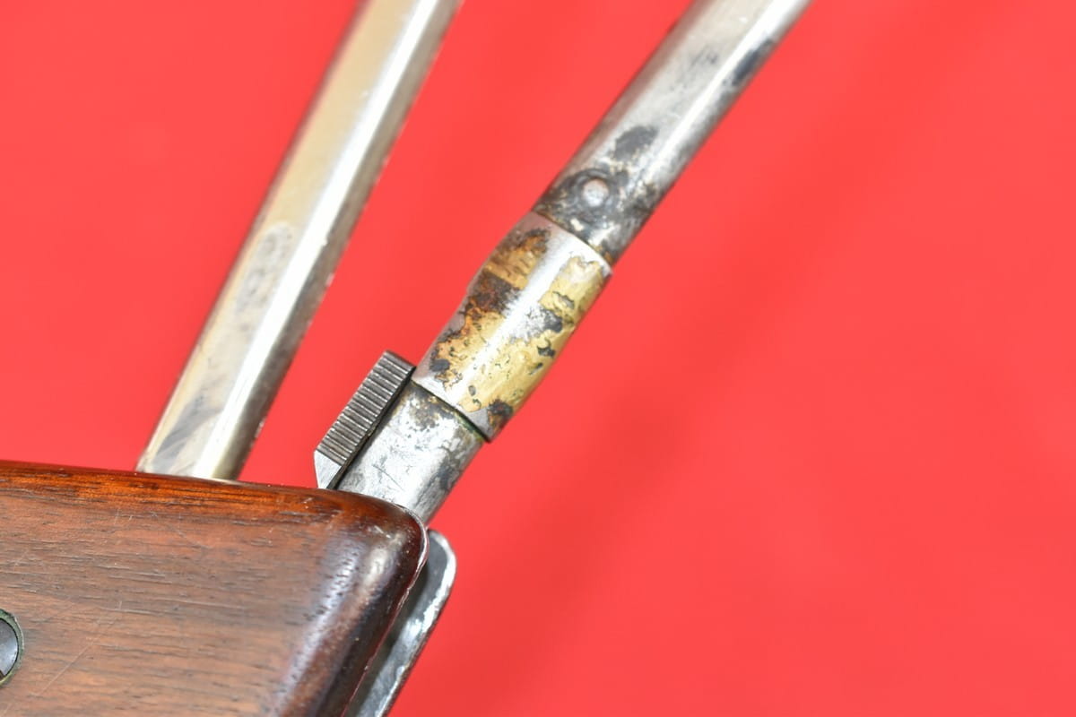 Pistolet w oryginalnej oksydzie, bez powojennych ingerencji (za wyjątkiem widocznej, bardzo starej naprawy kolby składanej.