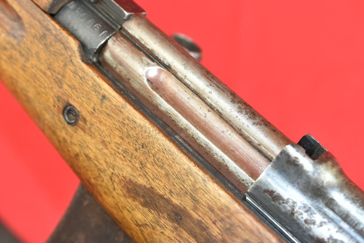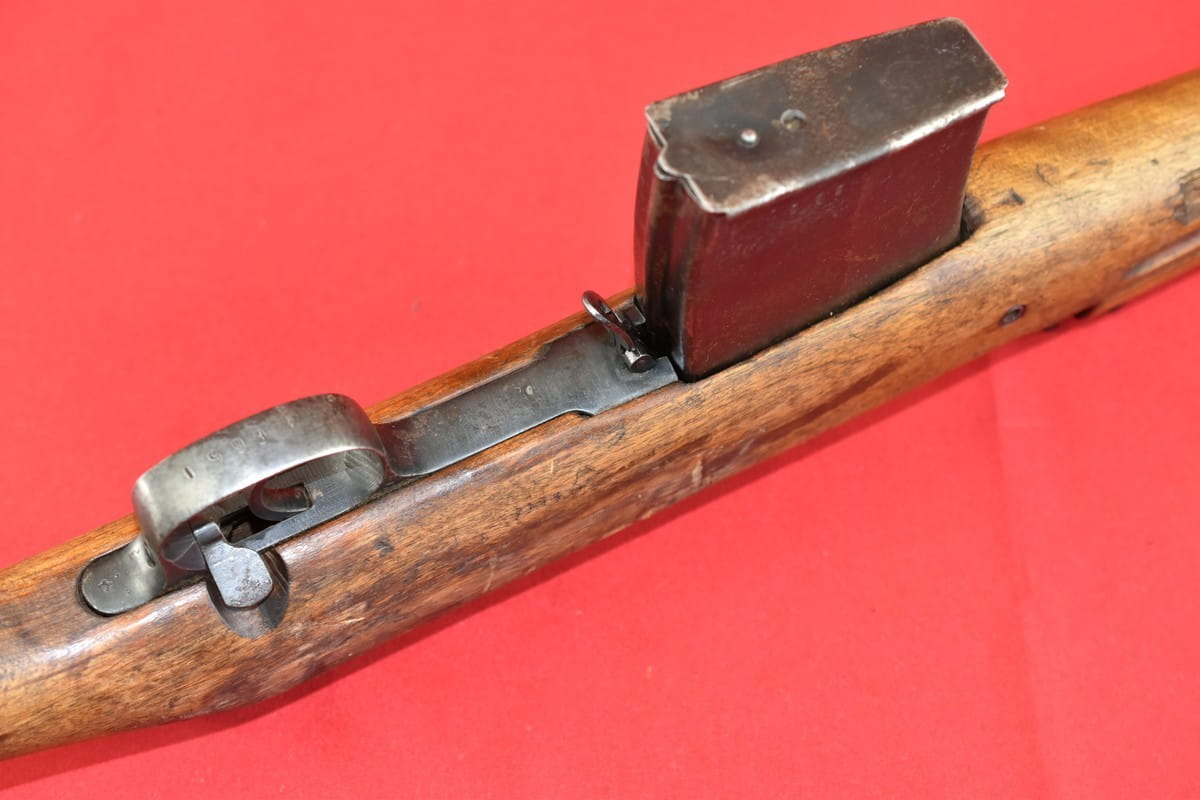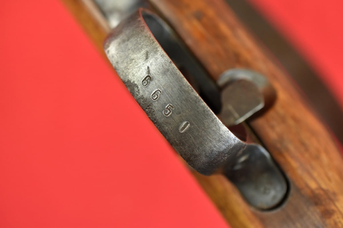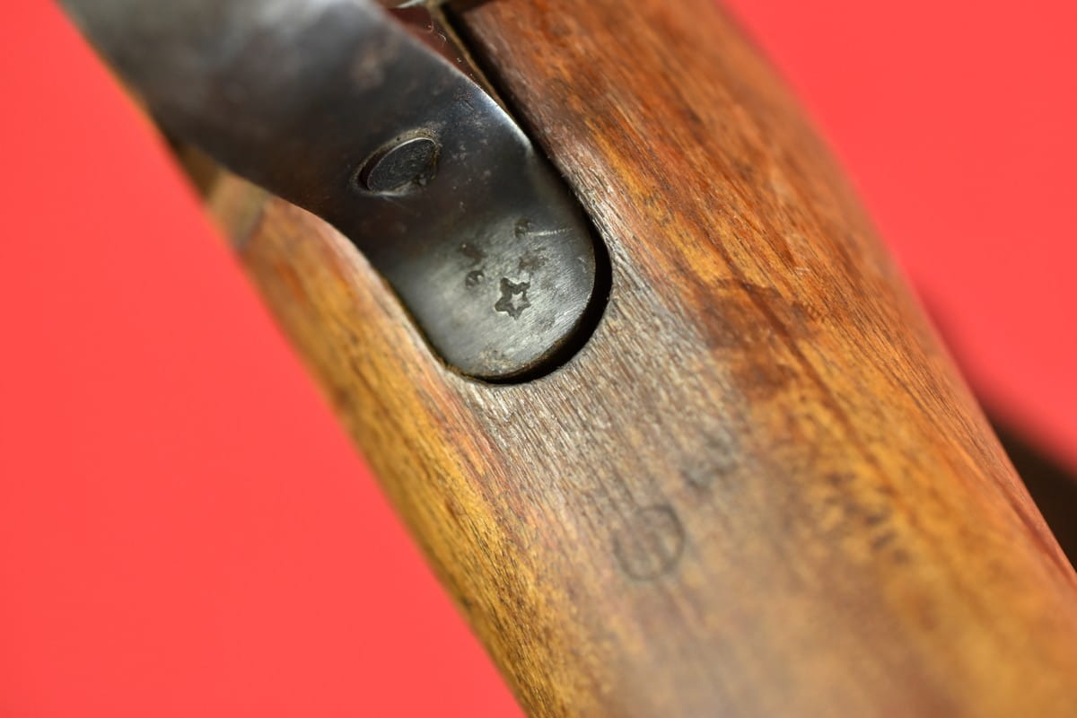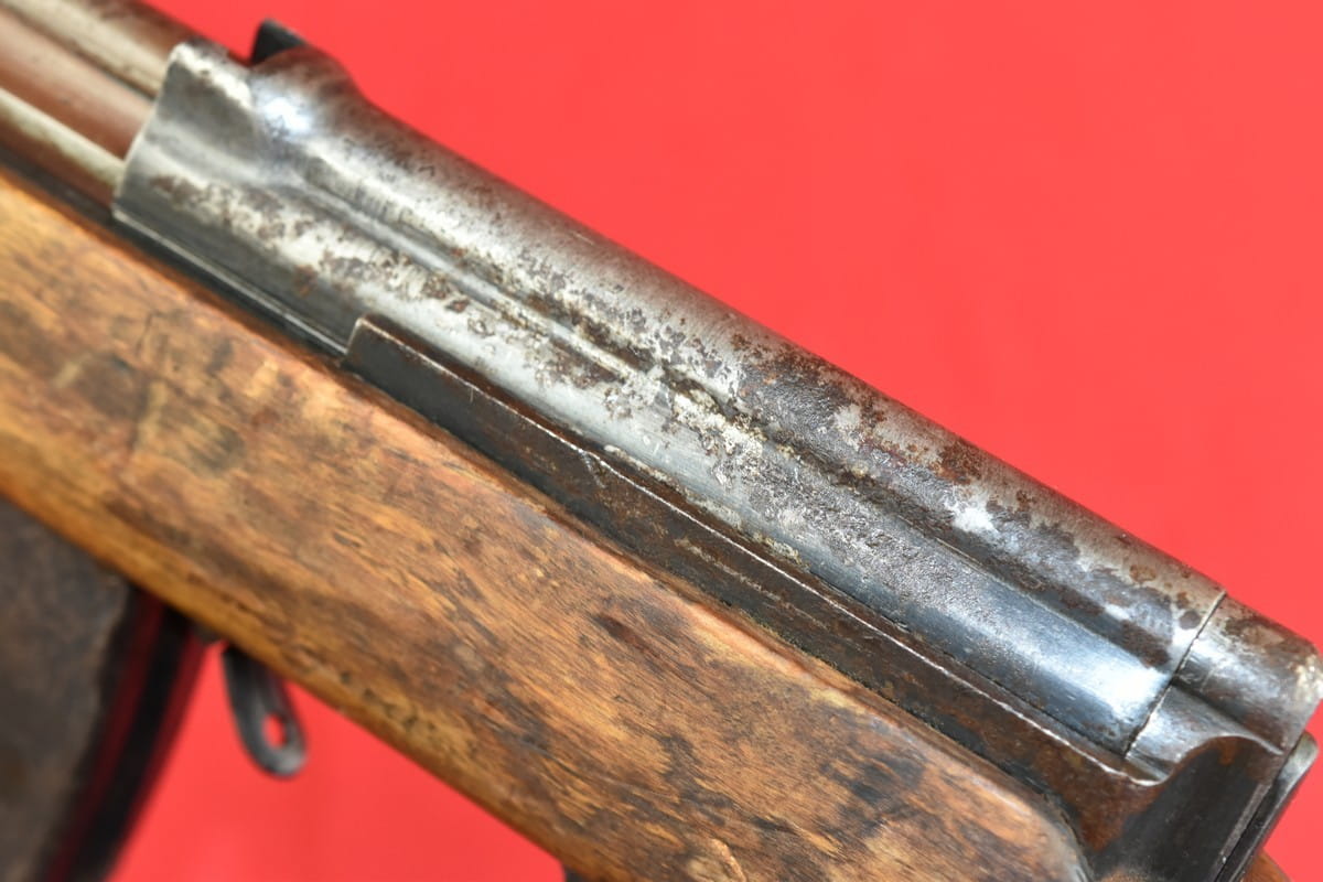 Oksyda oryginalna, z dużymi ubytkami, widoczna korozja. Karabin całkiem niedawno temu został znaleziony i zarejestrowany w jednym z krajów europejskich - gdzie procedura rejestracji takich znalezisk jest zwykłą czynnością administracyjną wykonywaną za pośrednictwem dilera z odpowiednią licencją na obrót bronią - w tym wypadku samoczynną.