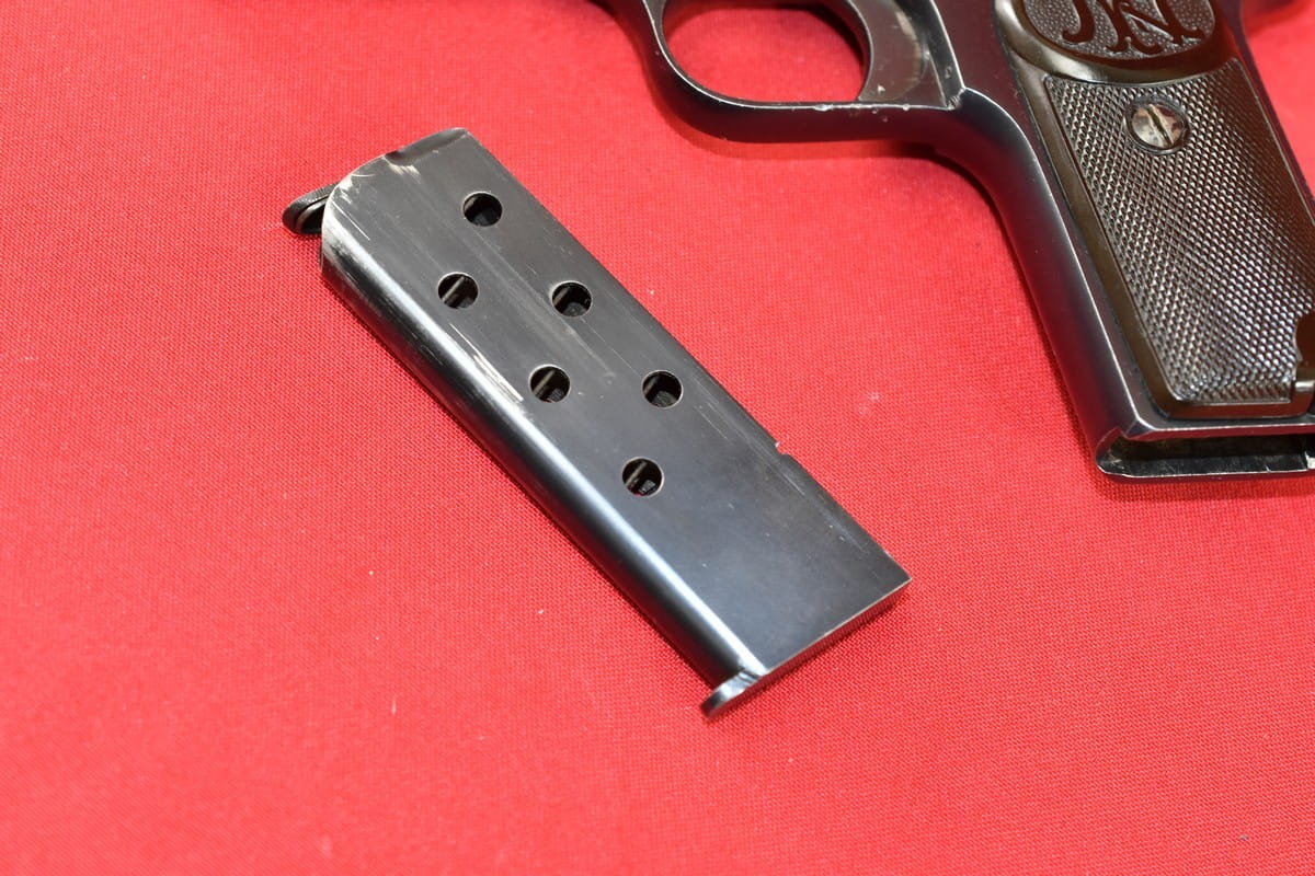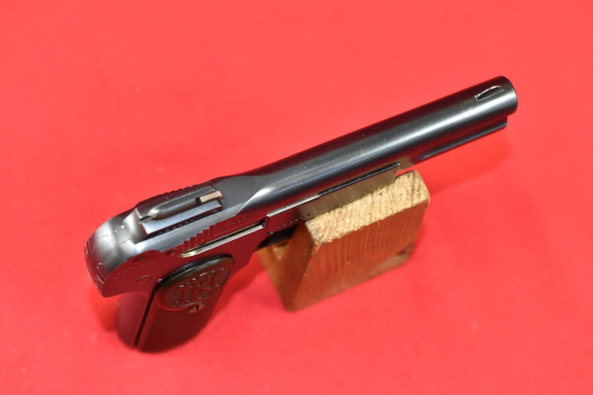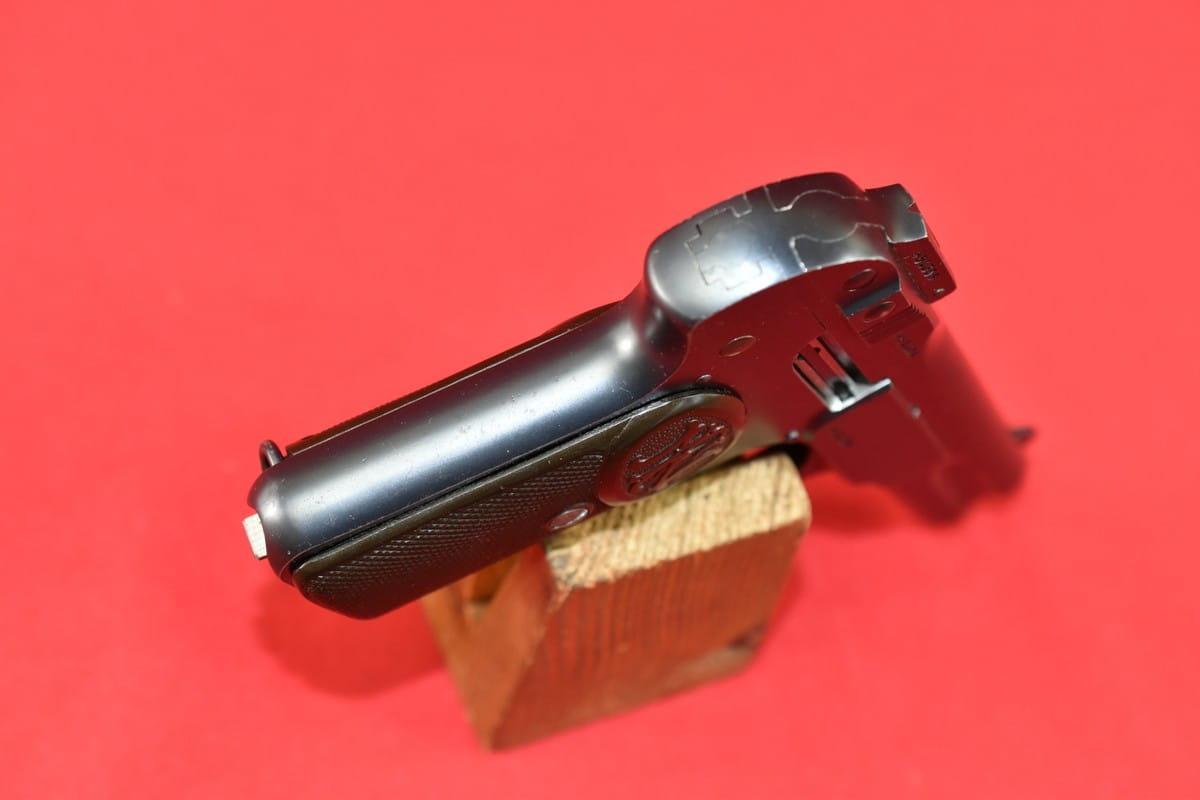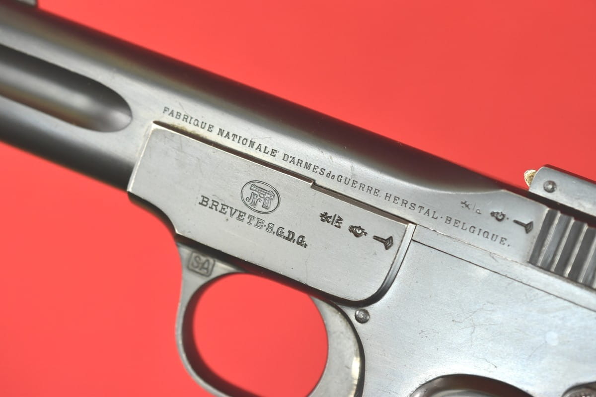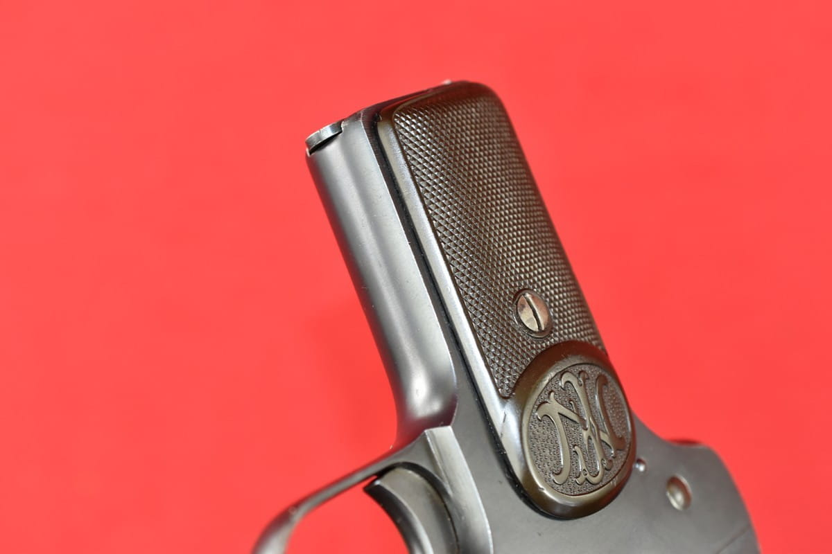 FN Model 1900 był produkowany w latach 1900-1914. Okładziny mają logo (litery "FN") stosowane mniej więcej od roku 1905.