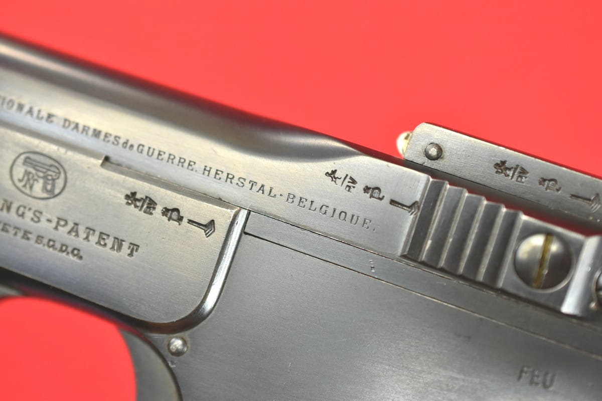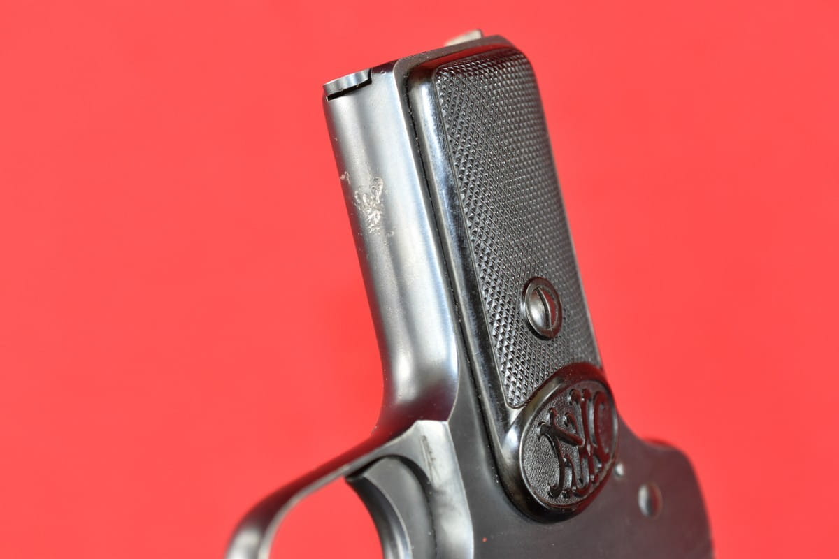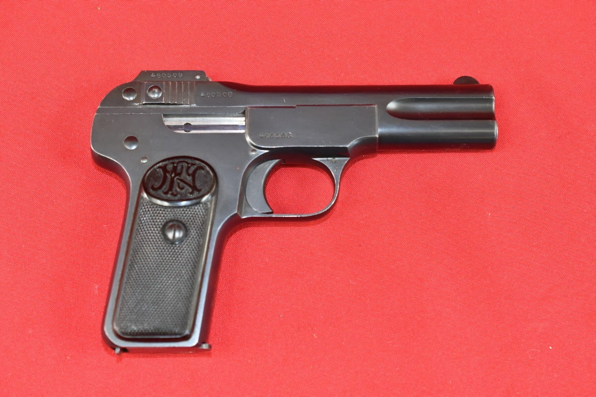 FN Model 1900 był produkowany w latach 1900-1914. Okładziny mają logo (litery "FN") stosowane mniej więcej od roku 1905.