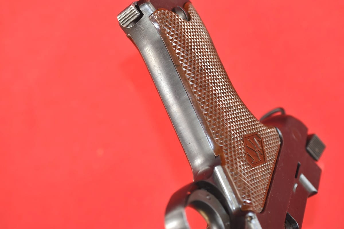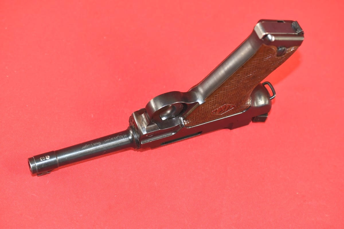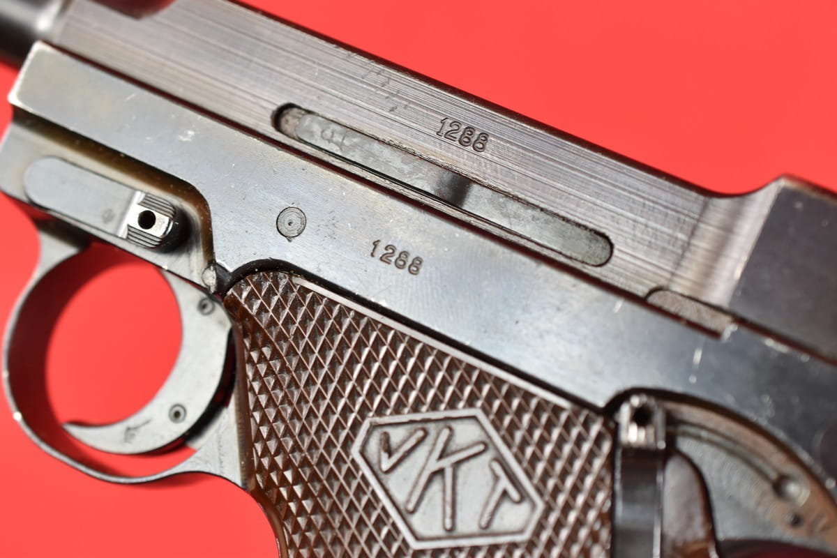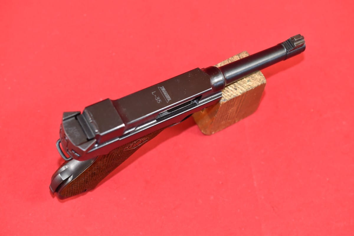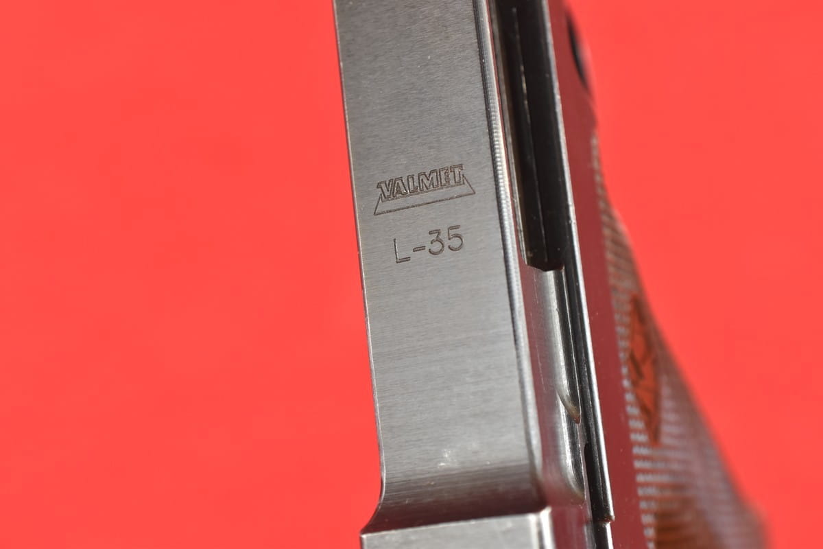 #5529 Pistolet Lahti L-35 kal. 9x19. Produkcja z tzw. I serii - z roku 1941. W latach powojennych poddany fińskiemu remontowi - podczas którego wymieniono komorę zamkową (najpewniej wraz z lufą). Na lufie obecne są stemple fińskiego atestu CiP z roku 2003 - oraz stempel firmy, która dokonała tej operacji. Sama komora zamkowa pochodzi z partii części zamiennych do L-35 wyprodukowanej w latach siedemdziesiątych.