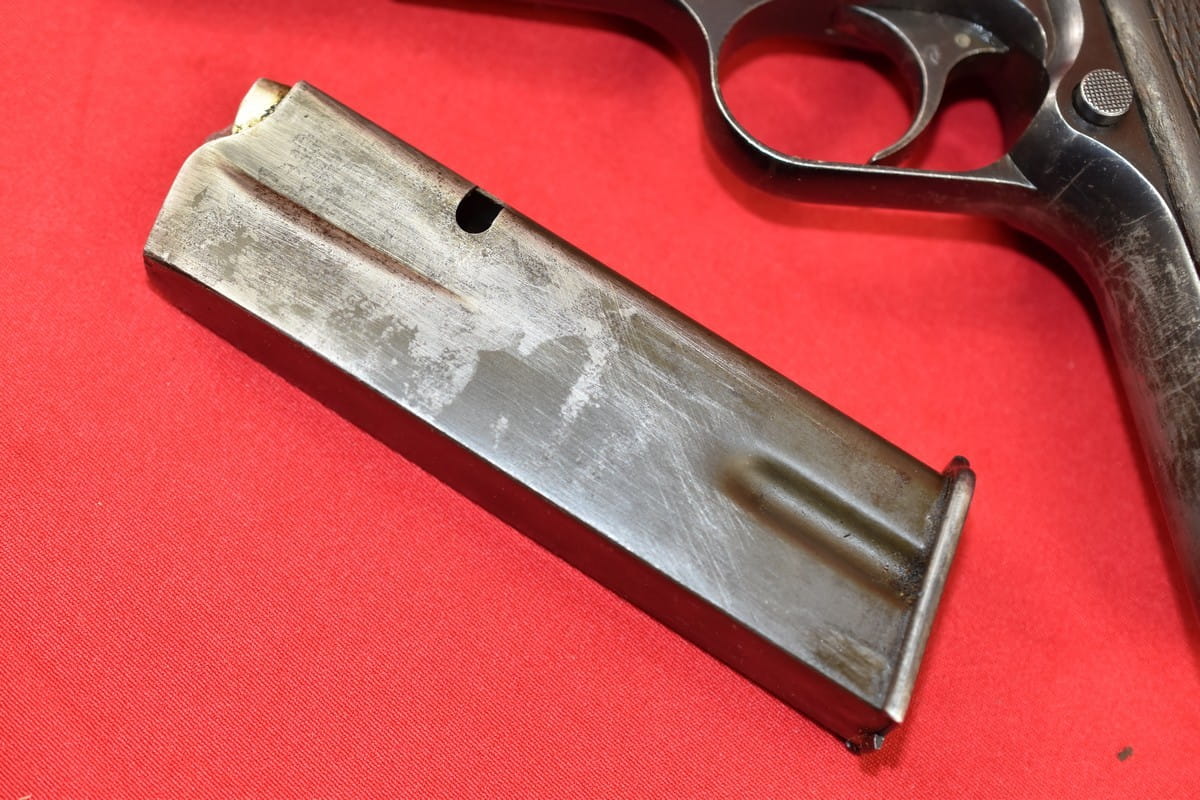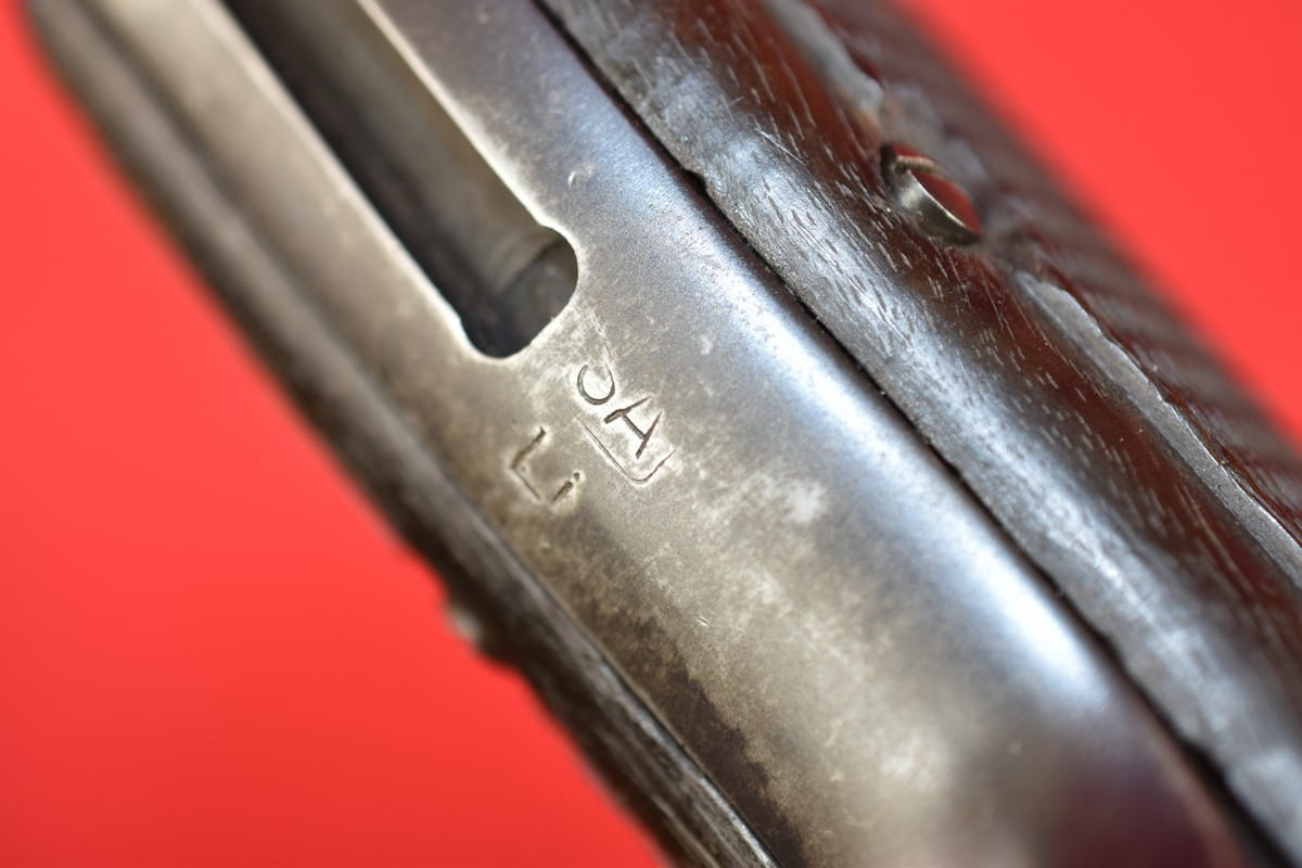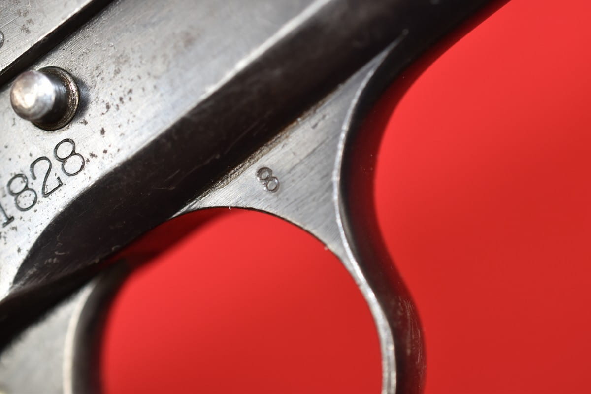 Egzemplarz w 100% oryginalny, zgodny numerycznie. Magazynek także oryginalny (nie powojenny) - stemplowany "SA". Okładziny (od wewnątrz) są oczywiście koloru czerwonego.