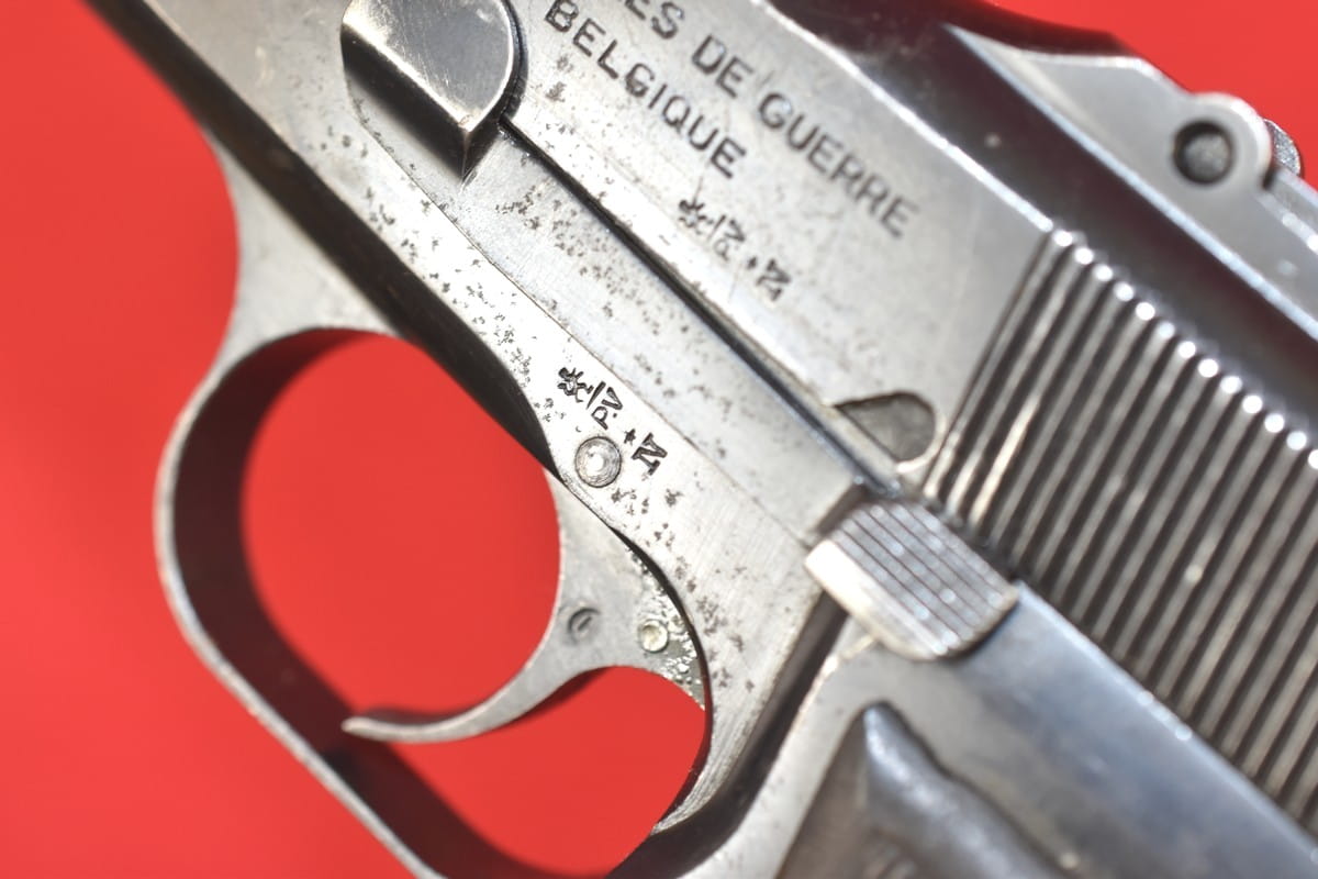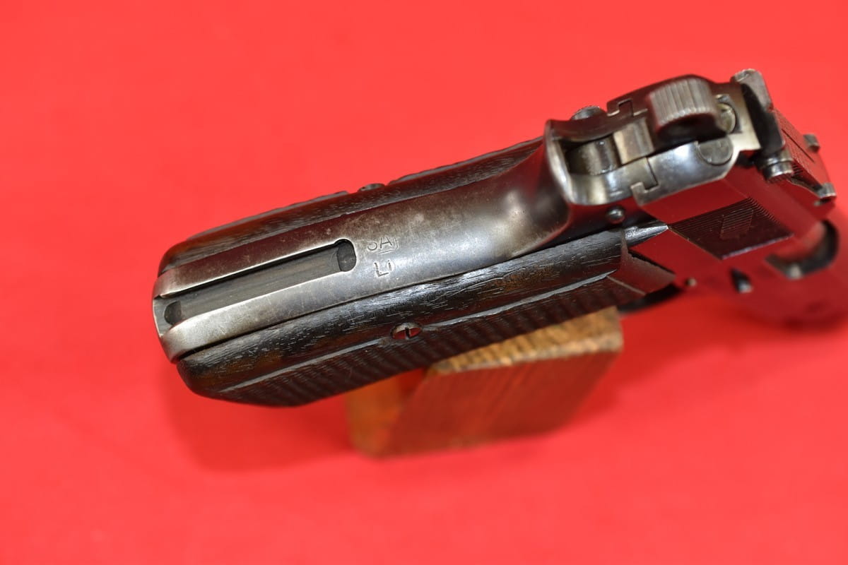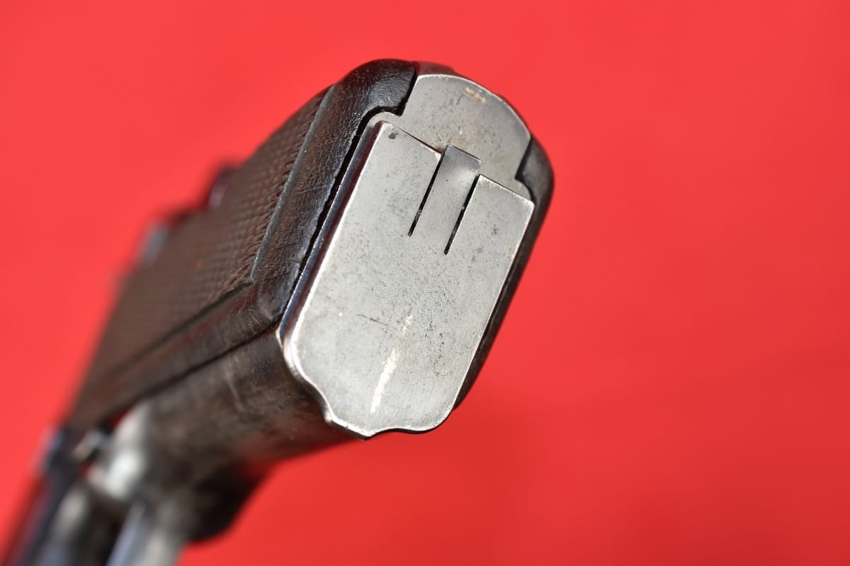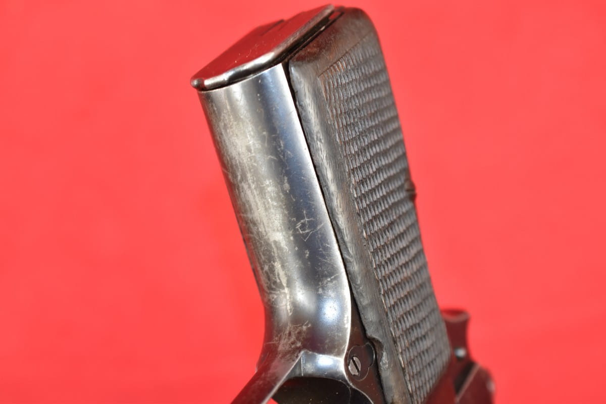 Egzemplarz w 100% oryginalny, zgodny numerycznie. Magazynek także oryginalny (nie powojenny) - stemplowany "SA". Okładziny (od wewnątrz) są oczywiście koloru czerwonego.