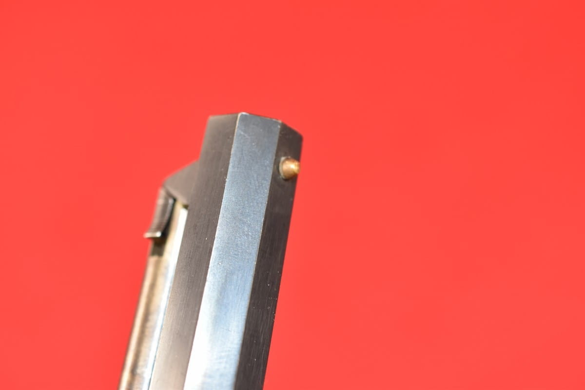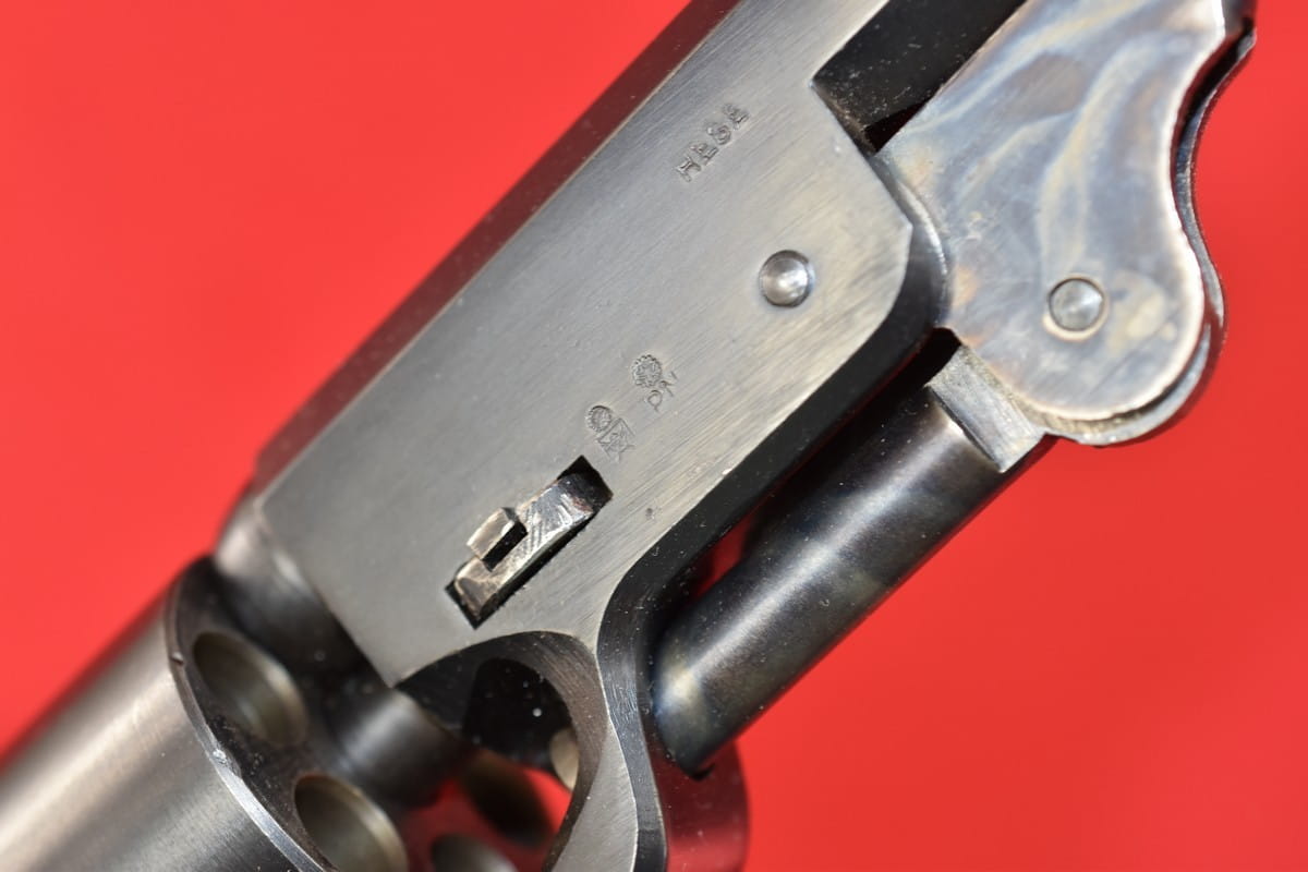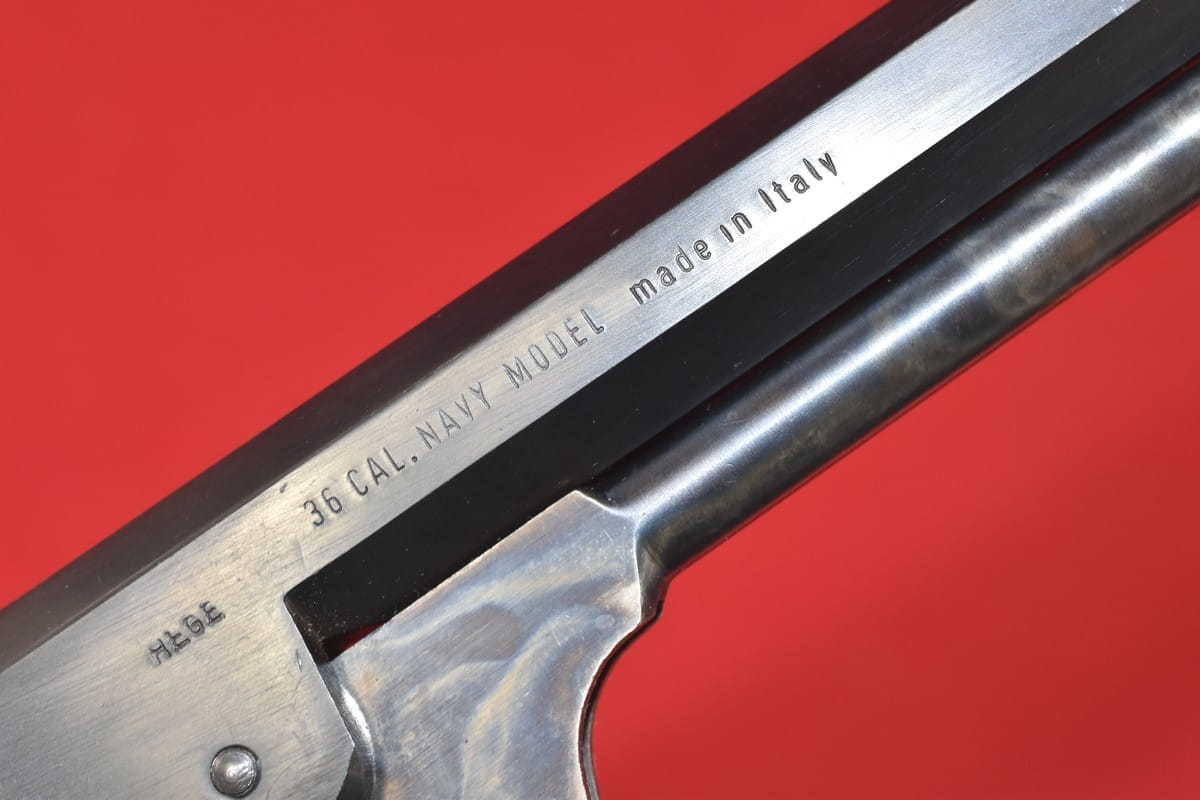 #6731 Rewolwer rozdzielnego ładowania Colt Navy 1851 kal. 36. Produkcja włoska z roku 1969 - czyli - jeśli chodzi przynajmniej o ten model - bardzo wczesna. Szkielet pokryty miejscowo silną patyną - ale bez żadnych wżerów. Pod palcem powierzchnia w tych miejscach nadal jest gładka.