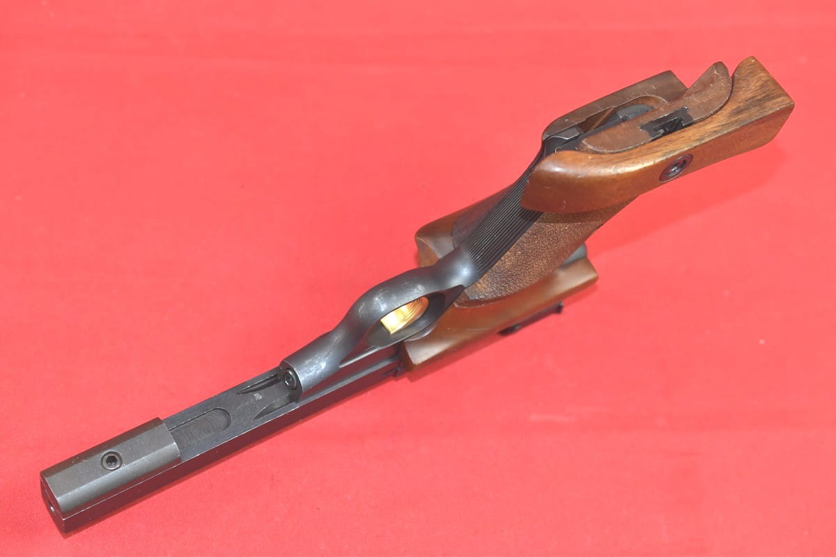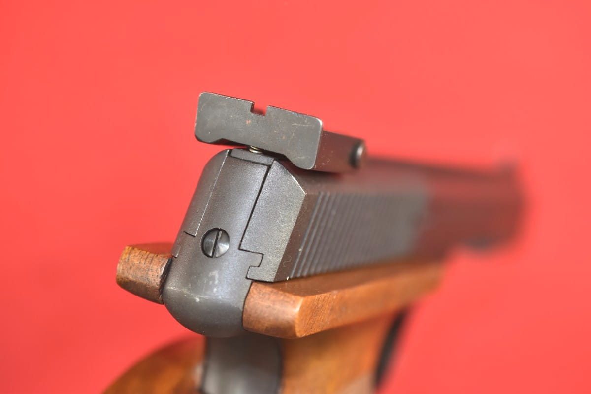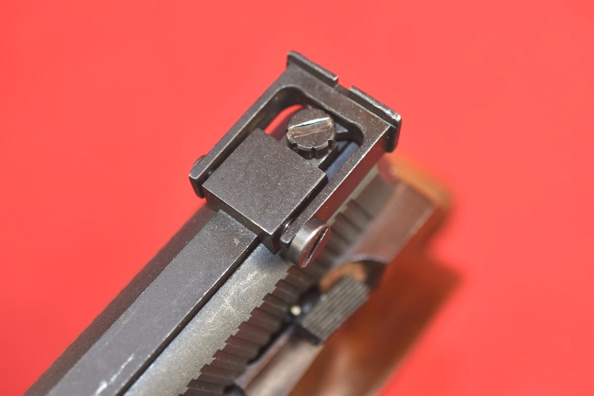 Szczerbina mikrometryczna. Zamek, po oddaniu ostatniego strzału, zatrzymuje się w tylnym położeniu.