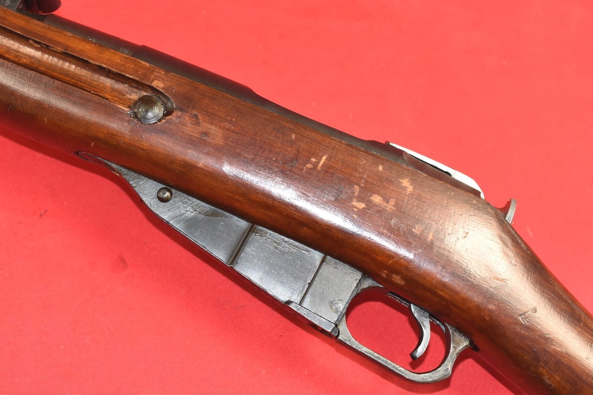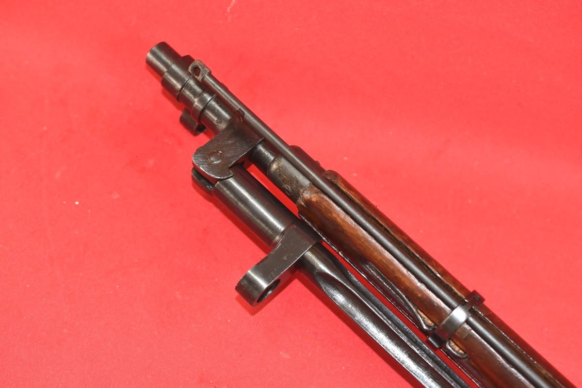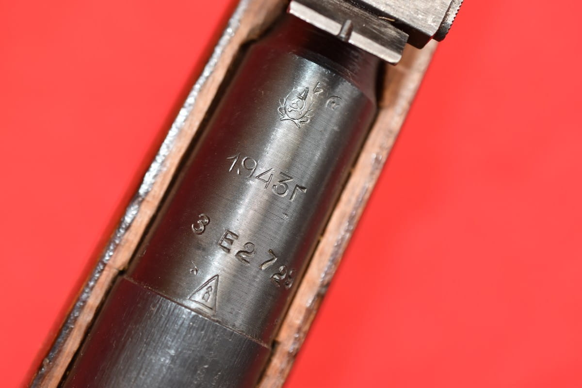 FABRYCZNIE WYPOSAŻONY W EKSPERYMENTALNY BAGNET Wz. 1943 - ZASTOSOWANY W FABRYCE IŻEWSK W CIĄGU 1943 ROKU - I WYPRODUKOWANY W NIEWIELKIEJ LICZBIE EGZEMPLARZY. POMYSŁ SKŁADANEGO BAGNETU STOSOWANEGO W MOSINIE 1891/30 BARDZO PRĘDKO ZARZUCONO - IDEĘ TĄ WDROŻONO NA STAŁE W MOSINIE Wz.44