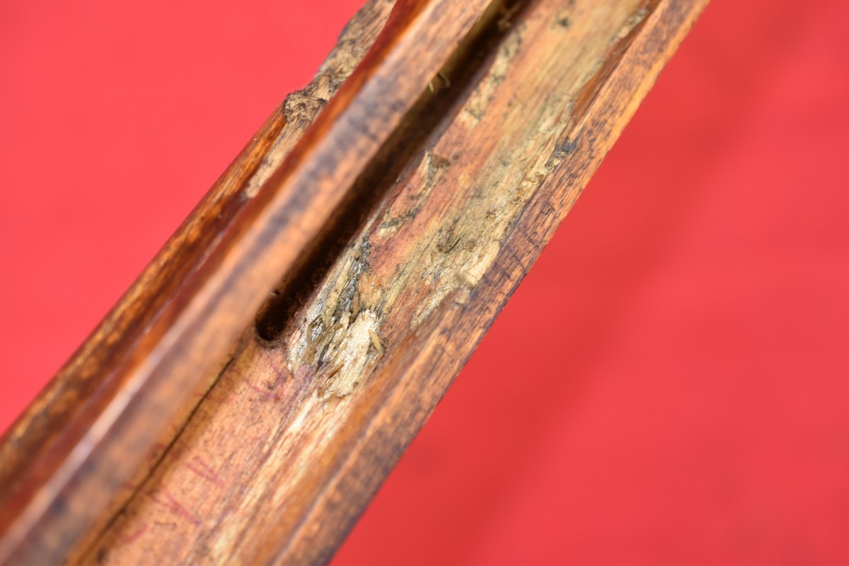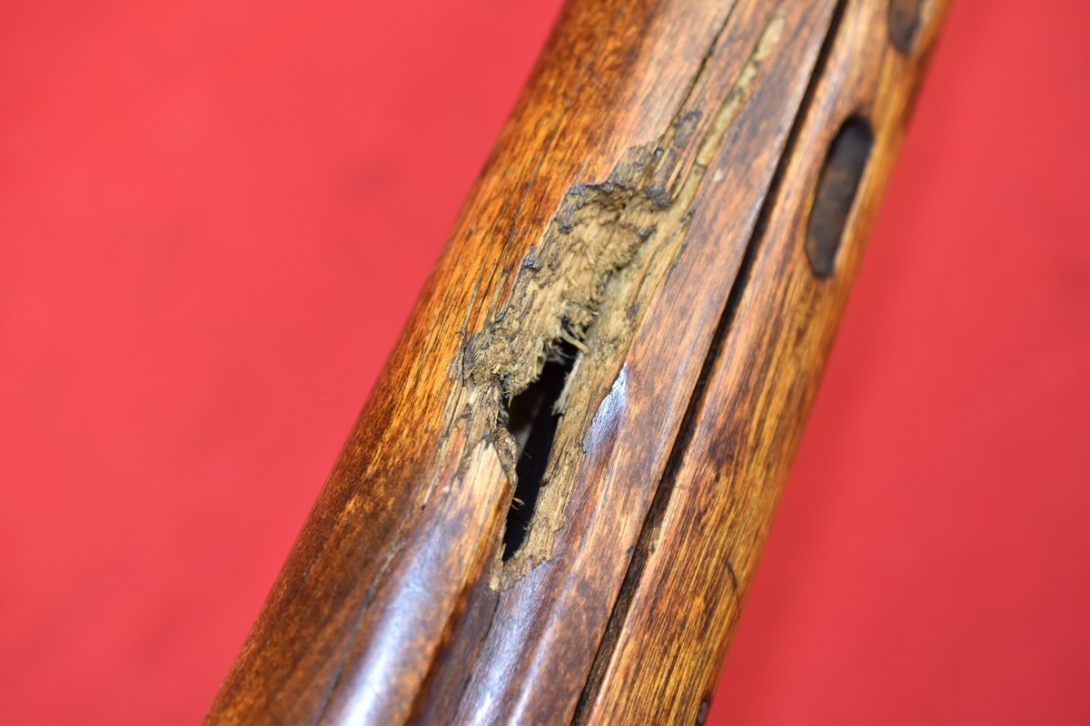 Egzemplarz niezgodny numerycznie. W łożu kolby widoczny ślad po odłamku, który przebił je na wylot, powodując pęknięcia. Jest to drugi SWT-40 z takimi śladami, który przechodzi przez nasze ręce.