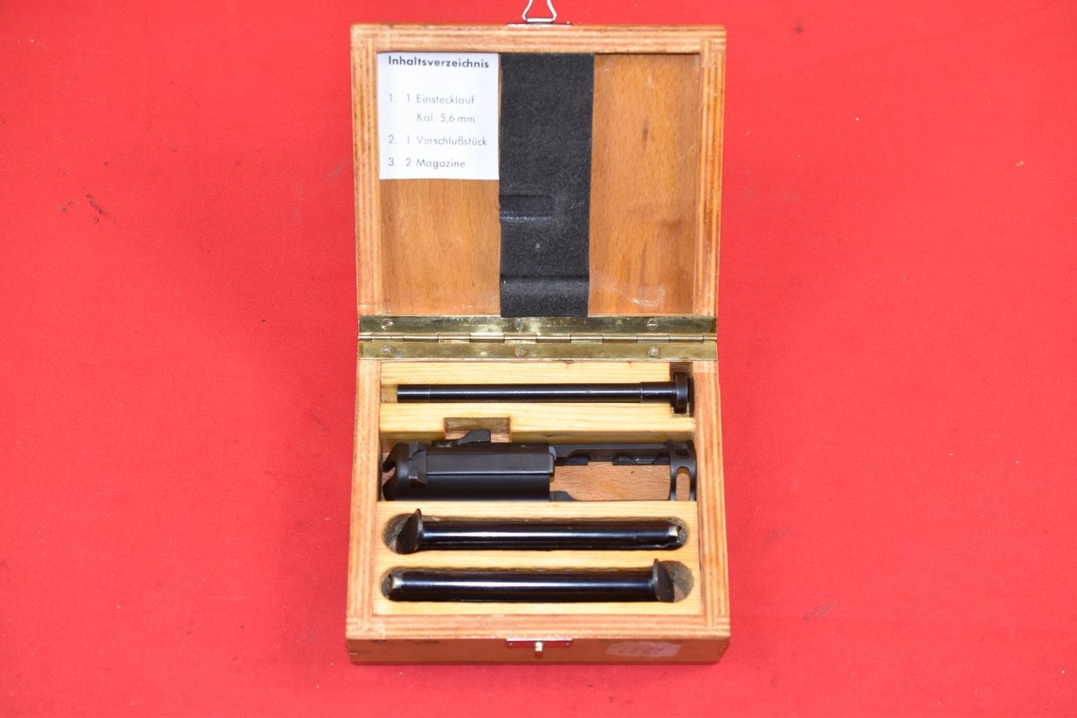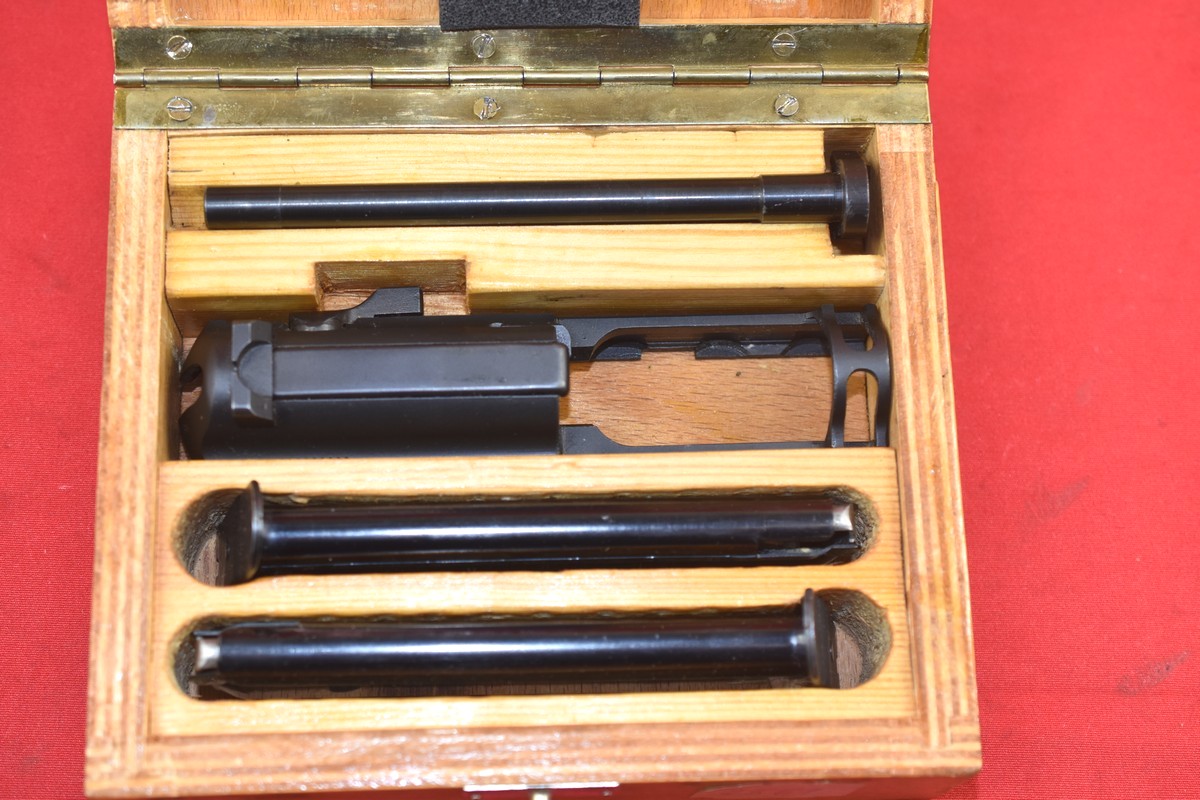 Oryginalne pudełko. Jeśli było z tego strzelane - to symbolicznie. Zgodny numerycznie - pudełko, lufa i zamek mają ten sam numer. Magazynki nienumerowane.