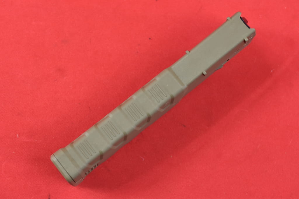 Na frontowej części magazynka umieszczono żebrowanie i teksturowanie, które zapewniają pewny chwyt nawet mokrymi bądź zabrudzonymi dłońmi.