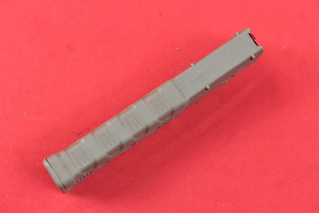 Na frontowej części magazynka umieszczono żebrowanie i teksturowanie, które zapewniają pewny chwyt nawet mokrymi bądź zabrudzonymi dłońmi.